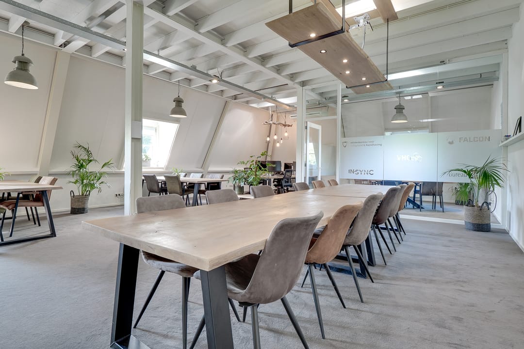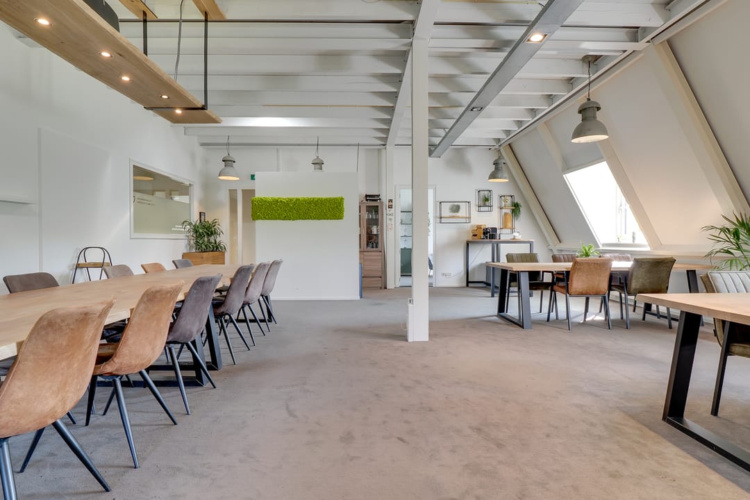 - balkenplafond in het gehuurde alsmede een deel van de algemene ruimten voorzien van elektrapunten, kabelgoten en verlichting;