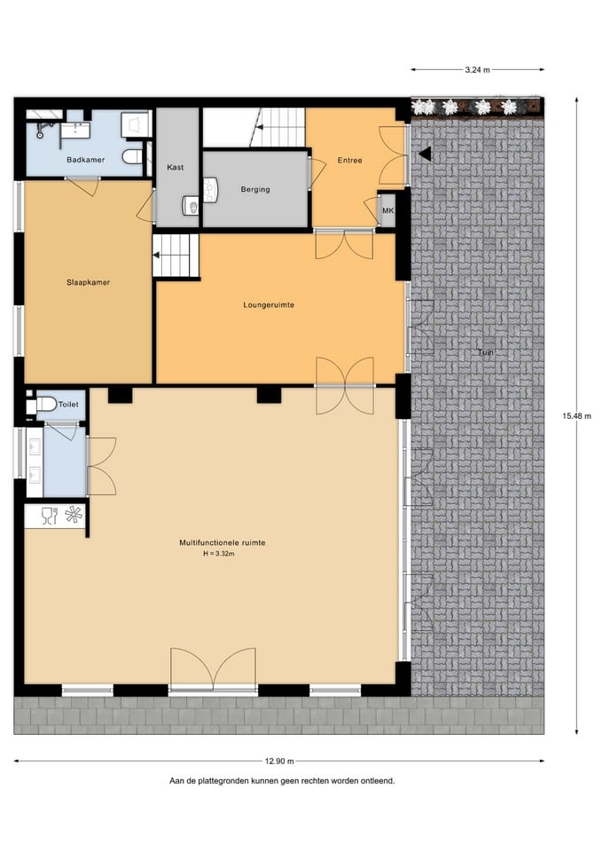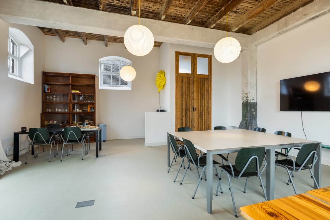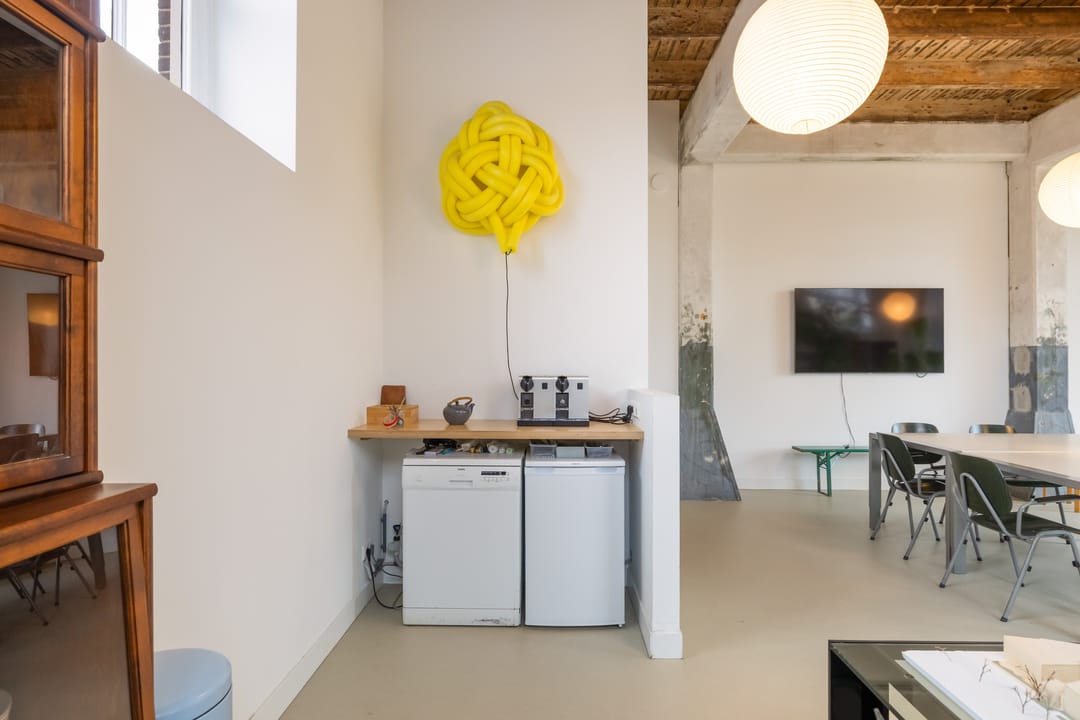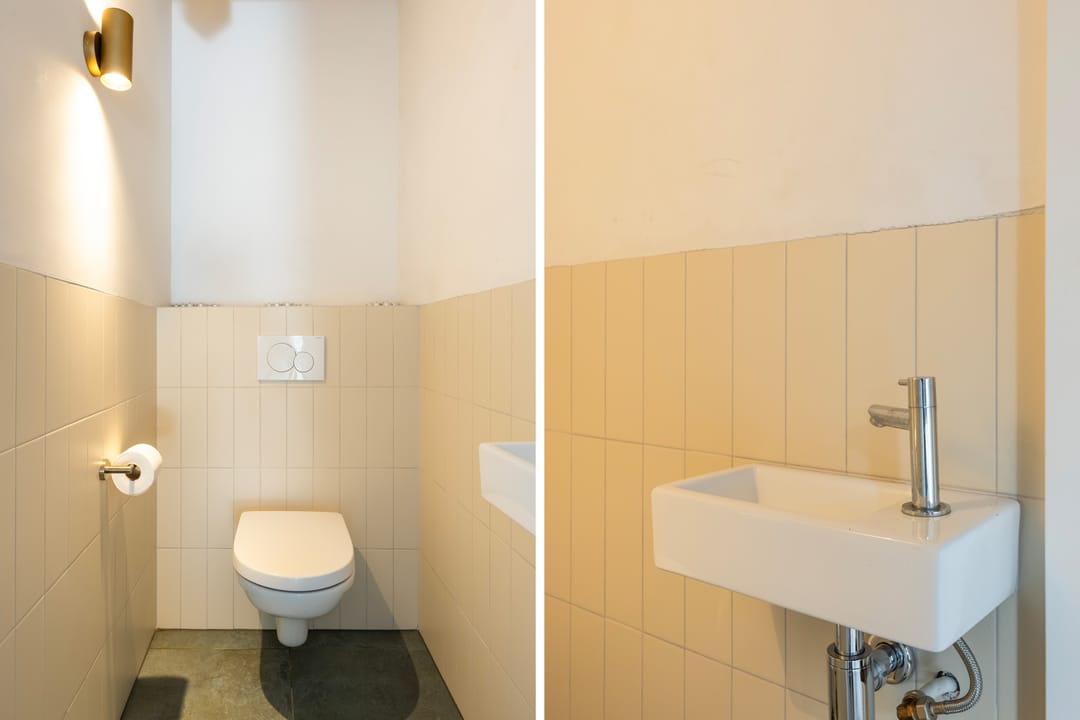 Aan weerszijden brengen hoge deuren in de kenmerkende stijl van het pand je naar respectievelijk de hal met trap naar boven en de multifunctionele ruimte. Deze ruimte is licht, open en indrukwekkend dankzij een hoogte van circa 3,3 meter. Grote raampartijen en openslaande deuren maken dit een ideale plek voor een atelier, kantoor, praktijkruimte of creatieve studio – maar ook kleinschalige horeca of bijvoorbeeld een koffiebar zouden hier perfect passen. De aanwezige pantry en het separate toilet zorgen ervoor dat werken en wonen volledig gescheiden kunnen blijven.