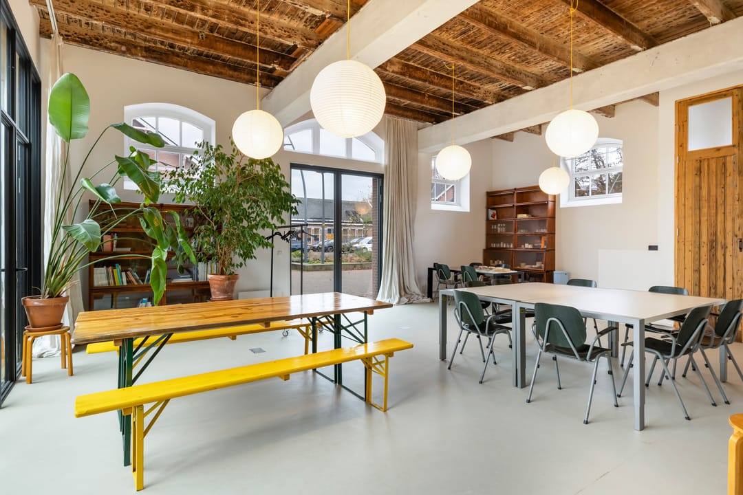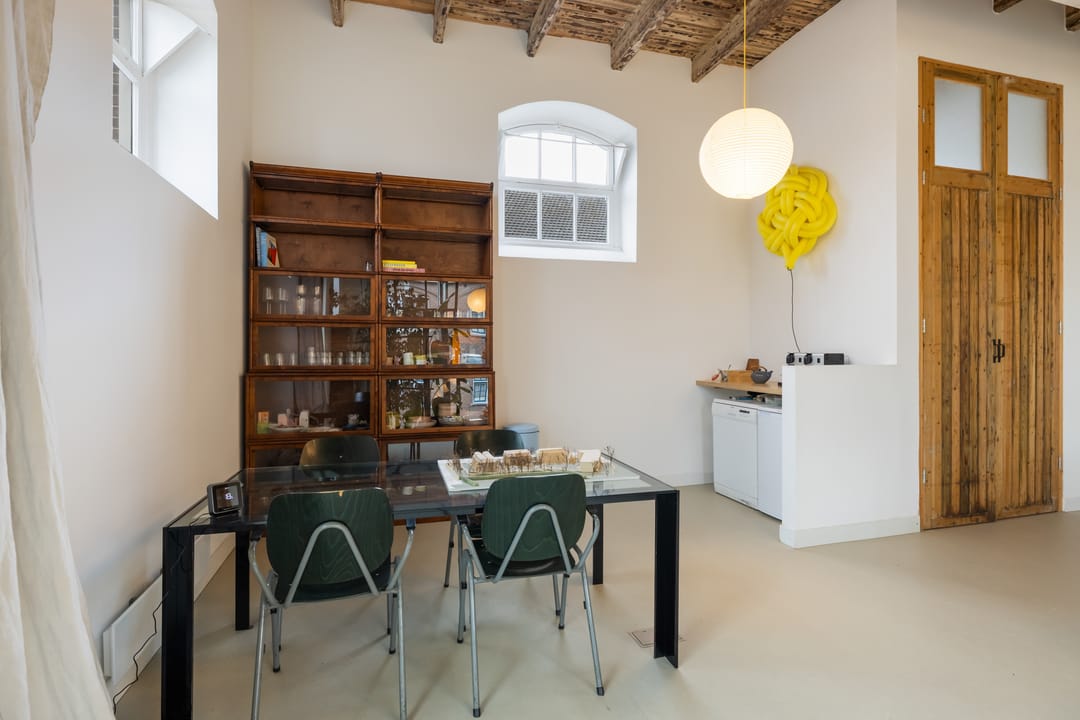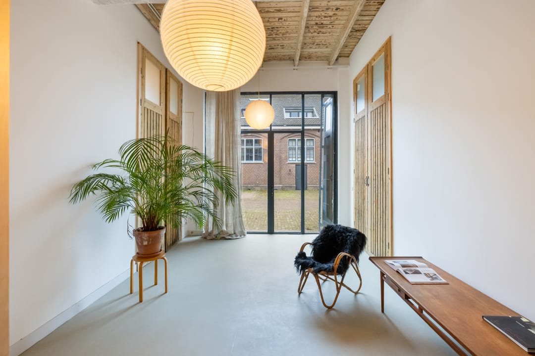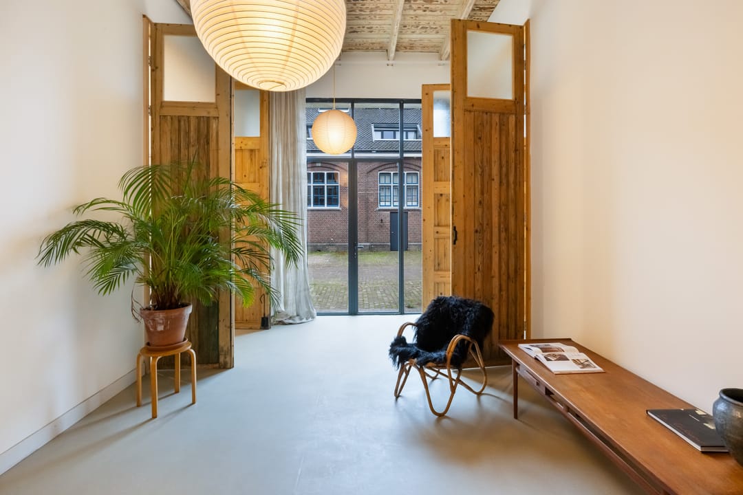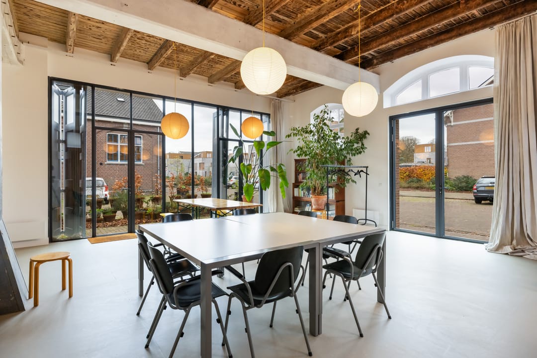 De imposante glazen pui van bijna 7 meter breed en 4 meter hoog vormt een echte eyecatcher en de dubbele deuren geven toegang tot zowel het woon- als werkdeel, die binnen met elkaar verbonden zijn via openslaande deuren maar buiten elk hun eigen entree hebben. De hoge plafonds, het stijlvolle materiaalgebruik en de grote mate van openheid zorgen voor een sterk loft-gevoel, waarbij de zichtbare balken en spanten een warme en karaktervolle sfeer creëren.