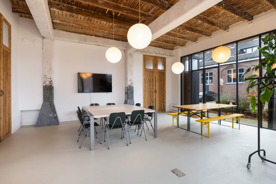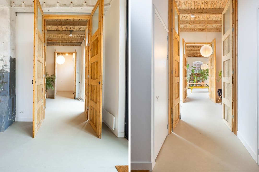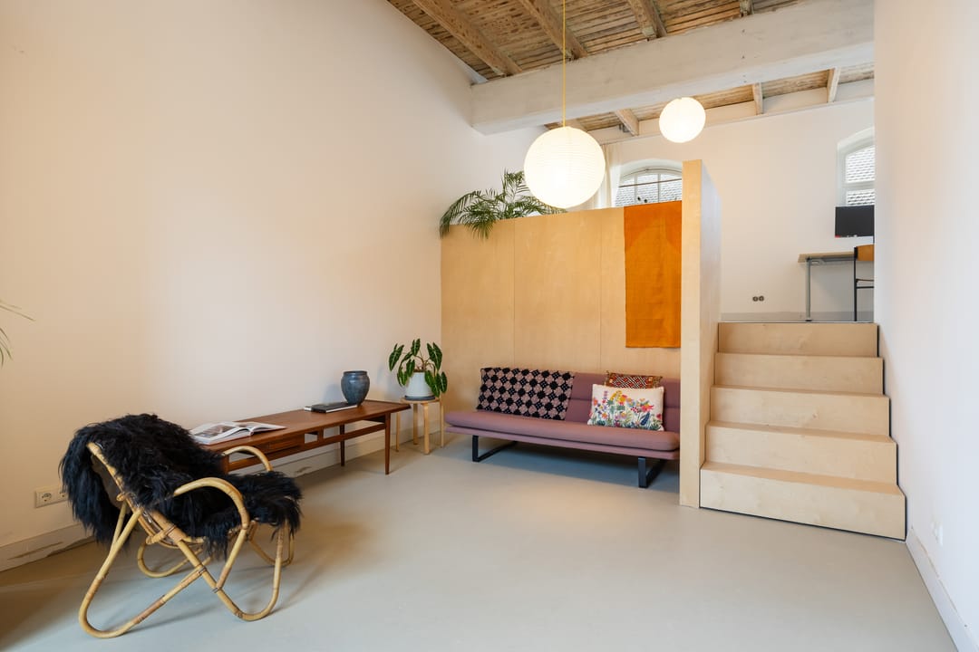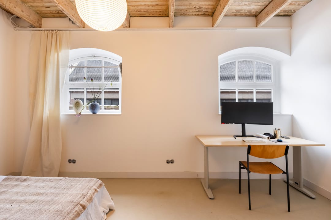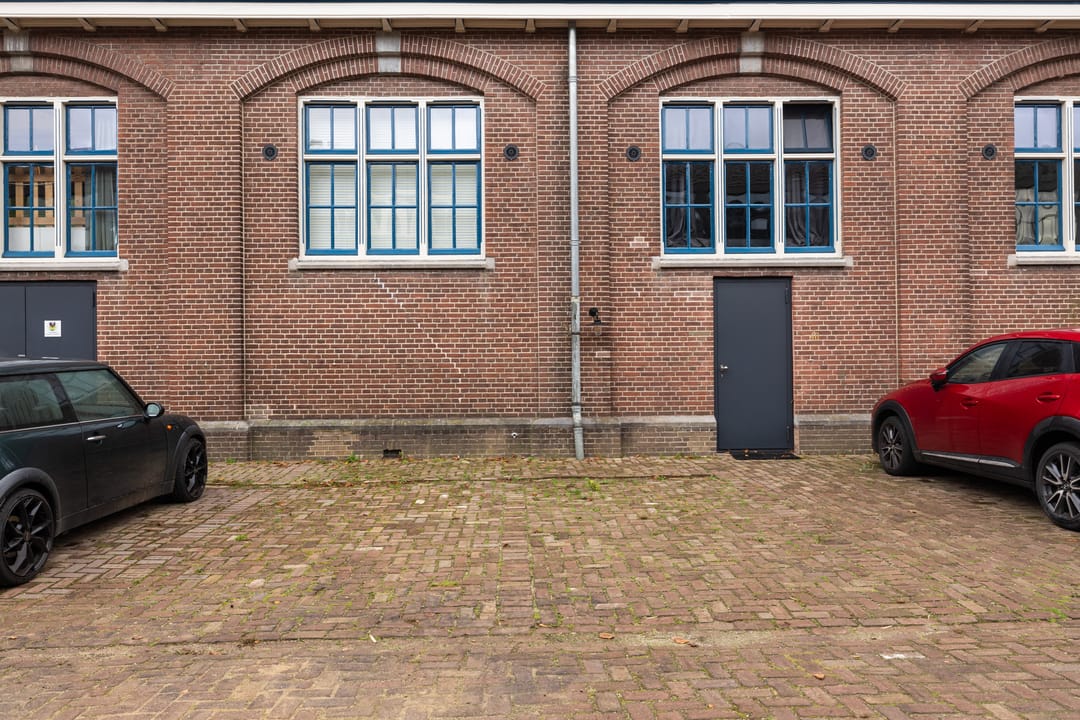 De imposante glazen pui van bijna 7 meter breed en 4 meter hoog vormt een echte eyecatcher en de dubbele deuren geven toegang tot zowel het woon- als werkdeel, die binnen met elkaar verbonden zijn via openslaande deuren maar buiten elk hun eigen entree hebben. De hoge plafonds, het stijlvolle materiaalgebruik en de grote mate van openheid zorgen voor een sterk loft-gevoel, waarbij de zichtbare balken en spanten een warme en karaktervolle sfeer creëren.