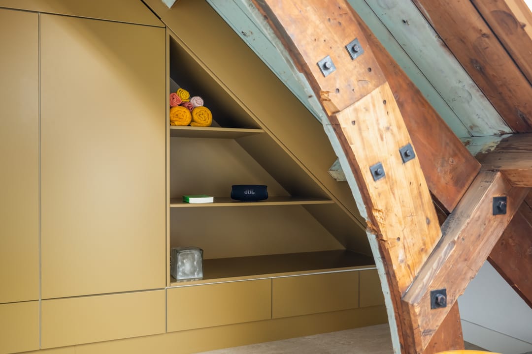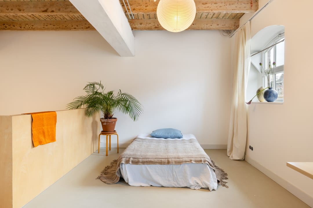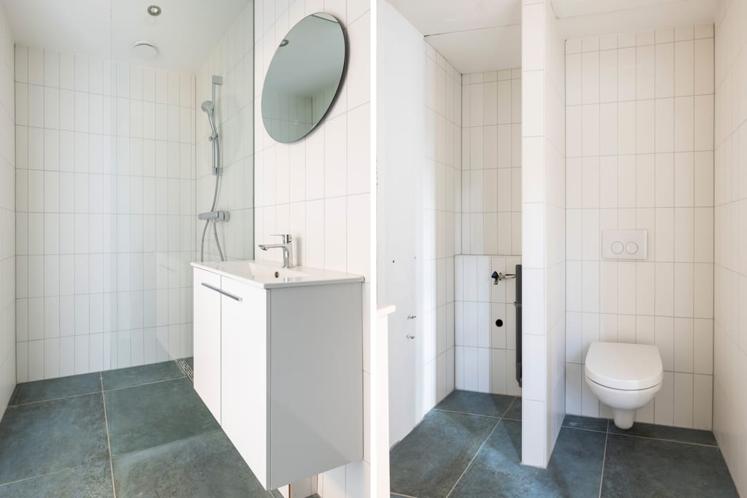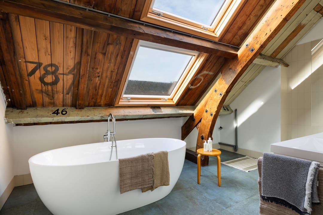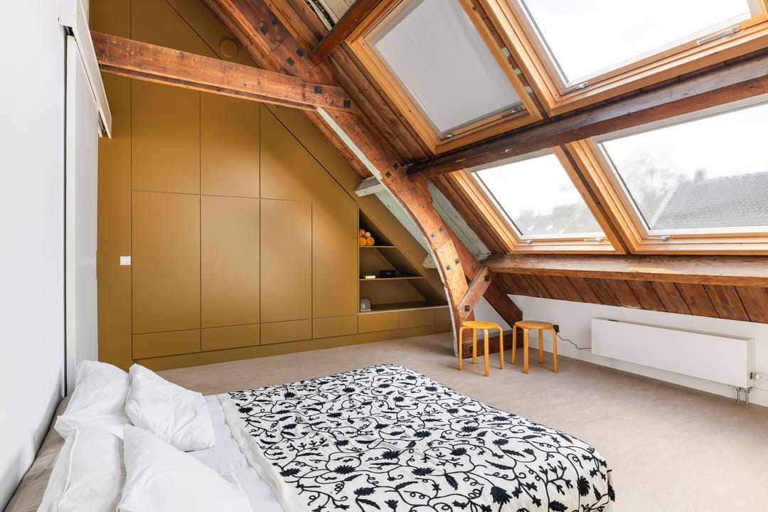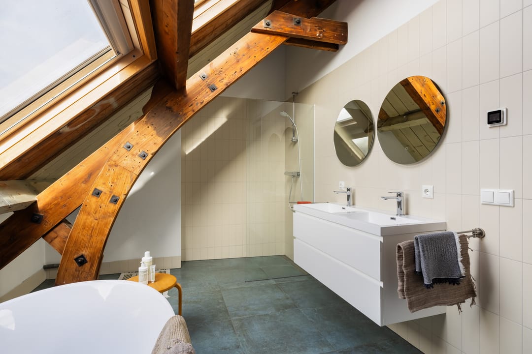 De eerste slaapkamer heeft vier dakramen en een vaste kastenwand. De tweede slaapkamer profiteert van de extra ruimte en lichtinval van de dakkapel. Aan de achterzijde bevindt zich de moderne badkamer, uitgerust met vloerverwarming, een vrijstaand ligbad, inloopdouche en dubbele wastafel. Daarnaast is er een separaat toilet.