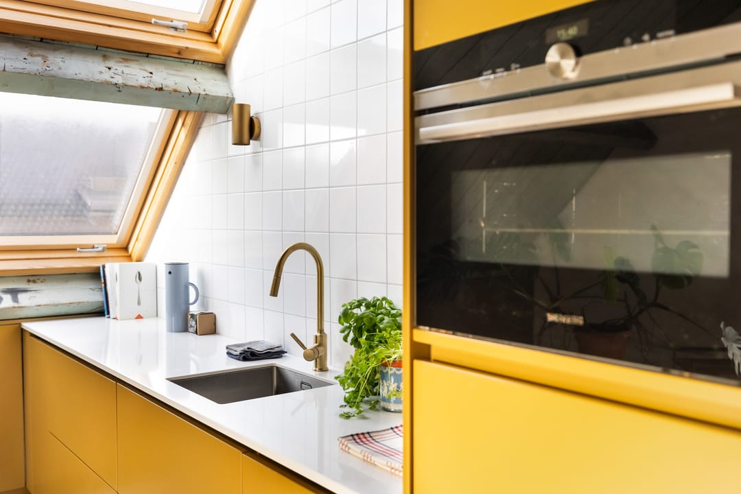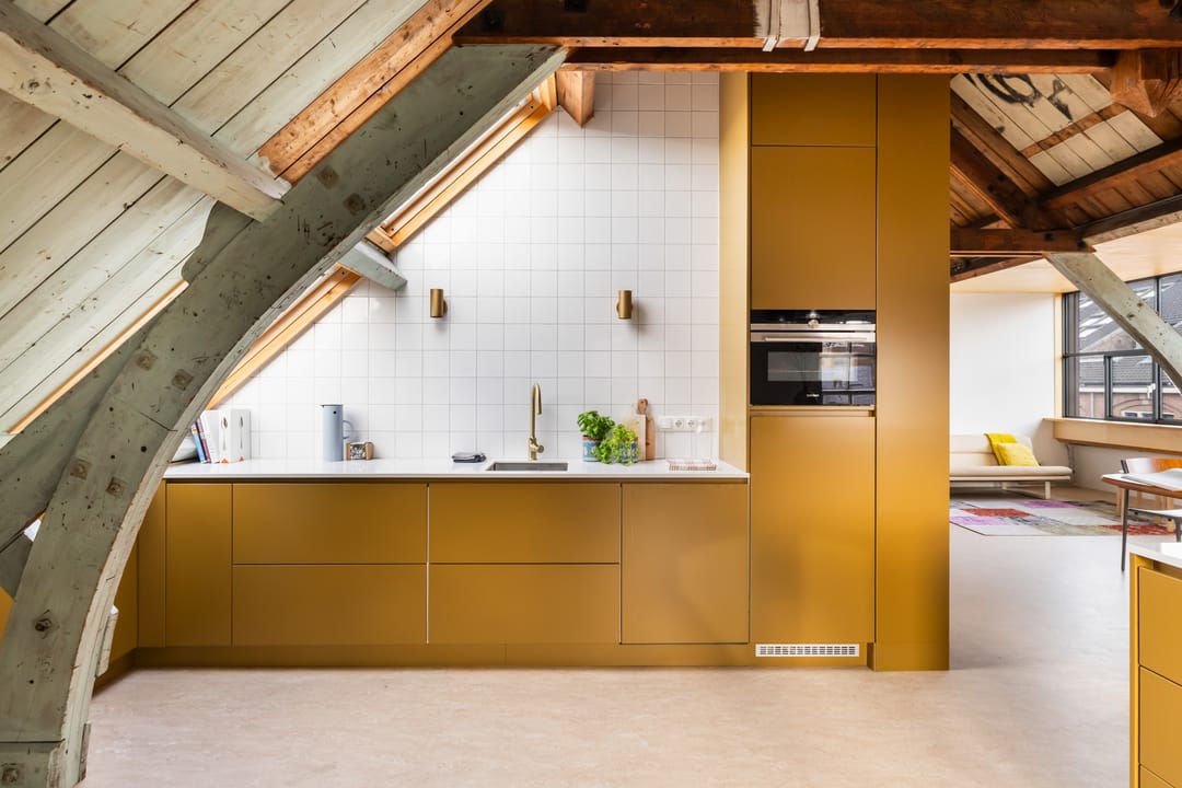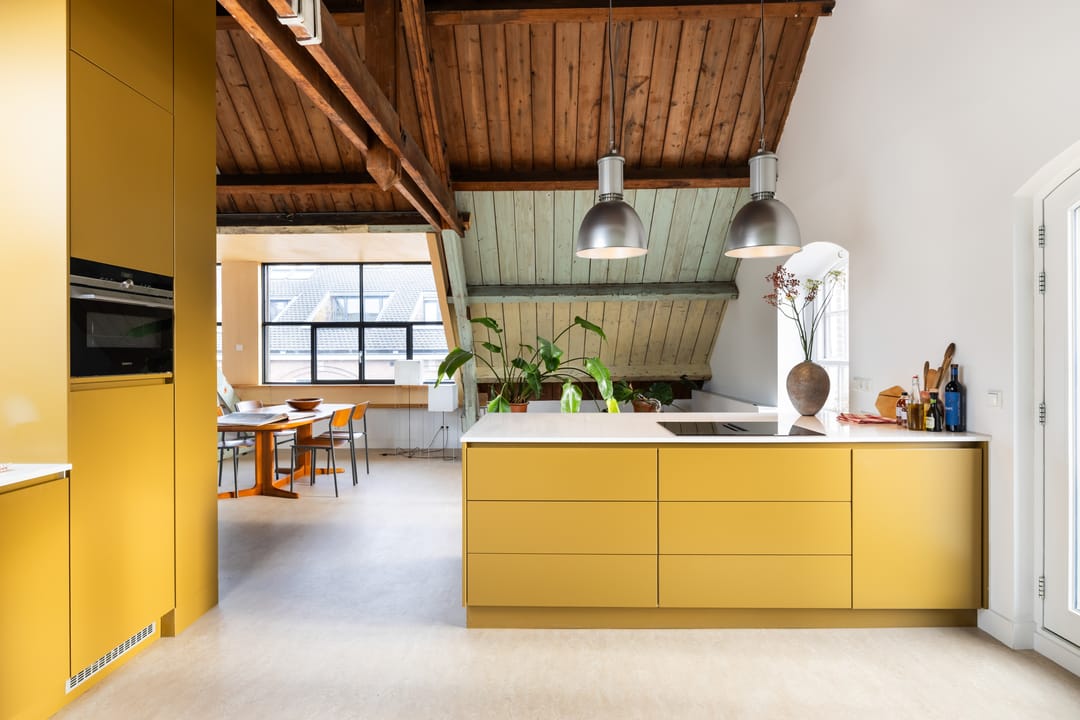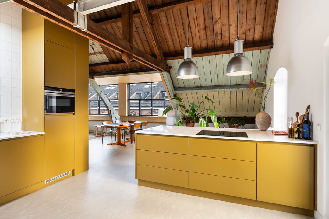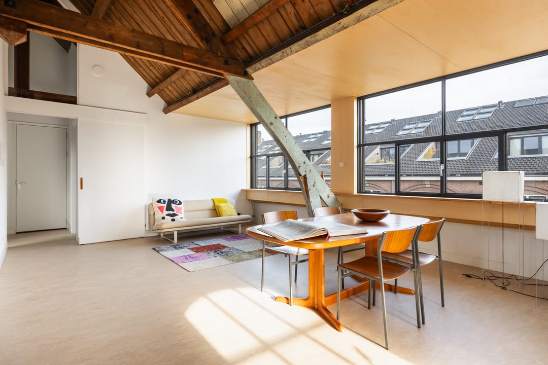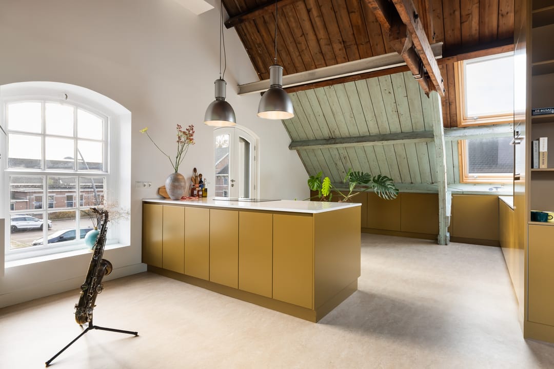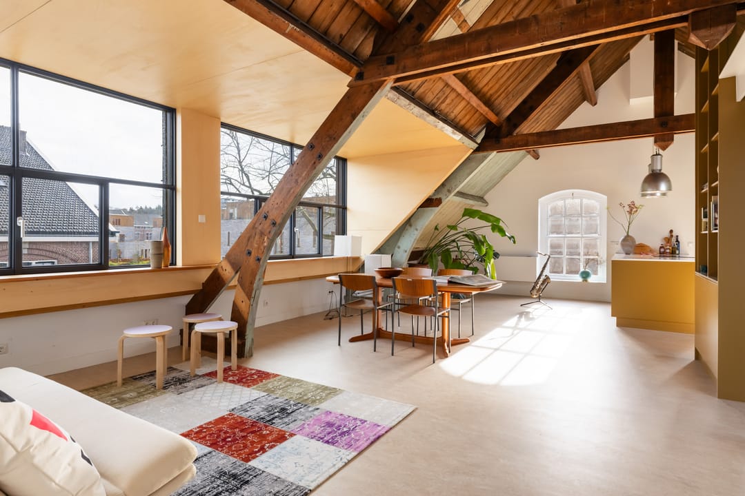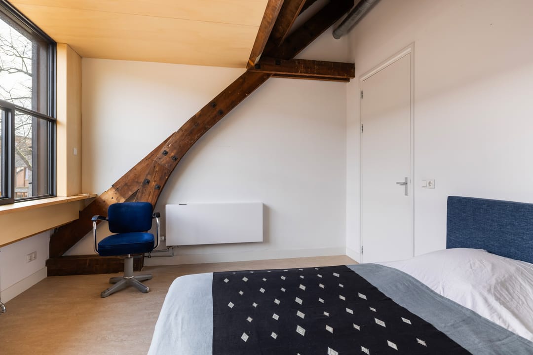 De vaste trap brengt je naar de bovenverdieping, waar de overloop toegang geeft tot alle ruimtes. Hier vind je twee ruime slaapkamers, een moderne badkamer en de sfeervolle woonkamer met open leefkeuken. De woonkamer heeft een prachtige hoogte van circa 4,6 meter in de nok, wat zorgt voor een ruimtelijk, licht en echt loftachtig gevoel. De grote dakkapel, het Franse balkon, meerdere dakramen en de oude stalramen laten het daglicht van alle kanten mooi binnenstromen. De oude houten balken en spanten zijn volledig in het zicht gelaten en vormen een prachtig contrast met de moderne afwerking. De open leefkeuken is een echte eyecatcher: praktisch ingedeeld met een schier-/kookeiland, volop kastruimte en hoogwaardige inbouwapparatuur (inductiekookplaat met geïntegreerde afzuiging, oven, koelkast, vriezer en vaatwasser). Het is een heerlijke plek om te koken, borrelen en samen te zijn. De verdieping is voorzien van een prachtige linoleumvloer en lage-temperatuurradiatoren die zowel kunnen verwarmen als koelen, wat bijdraagt aan optimaal wooncomfort in elk seizoen.