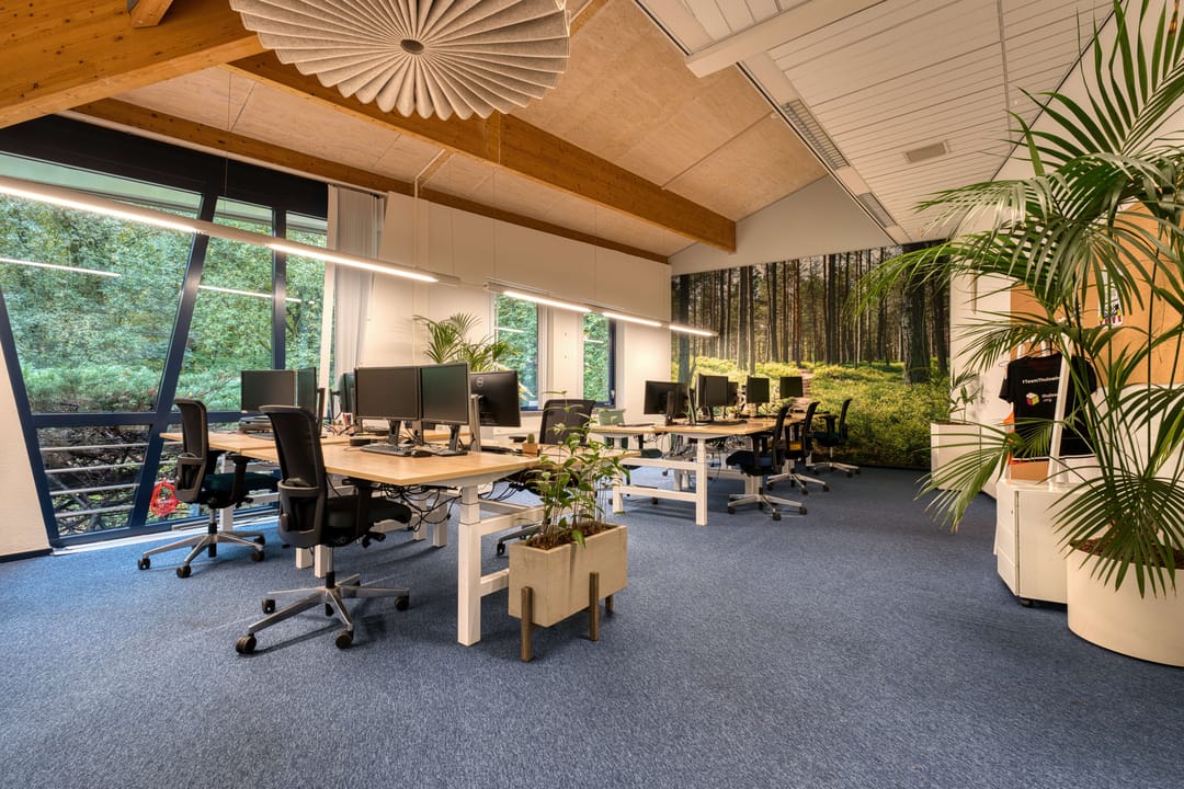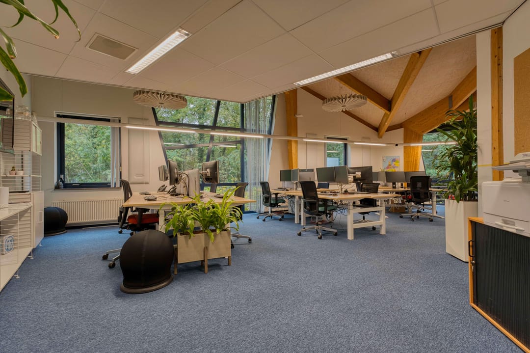 Als gevolg van de hoge plafonds met balken in het zicht, de speelse indeling en het royale lichtinval ontstaat hier een werkplek die als zeer comfortabel wordt ervaren!