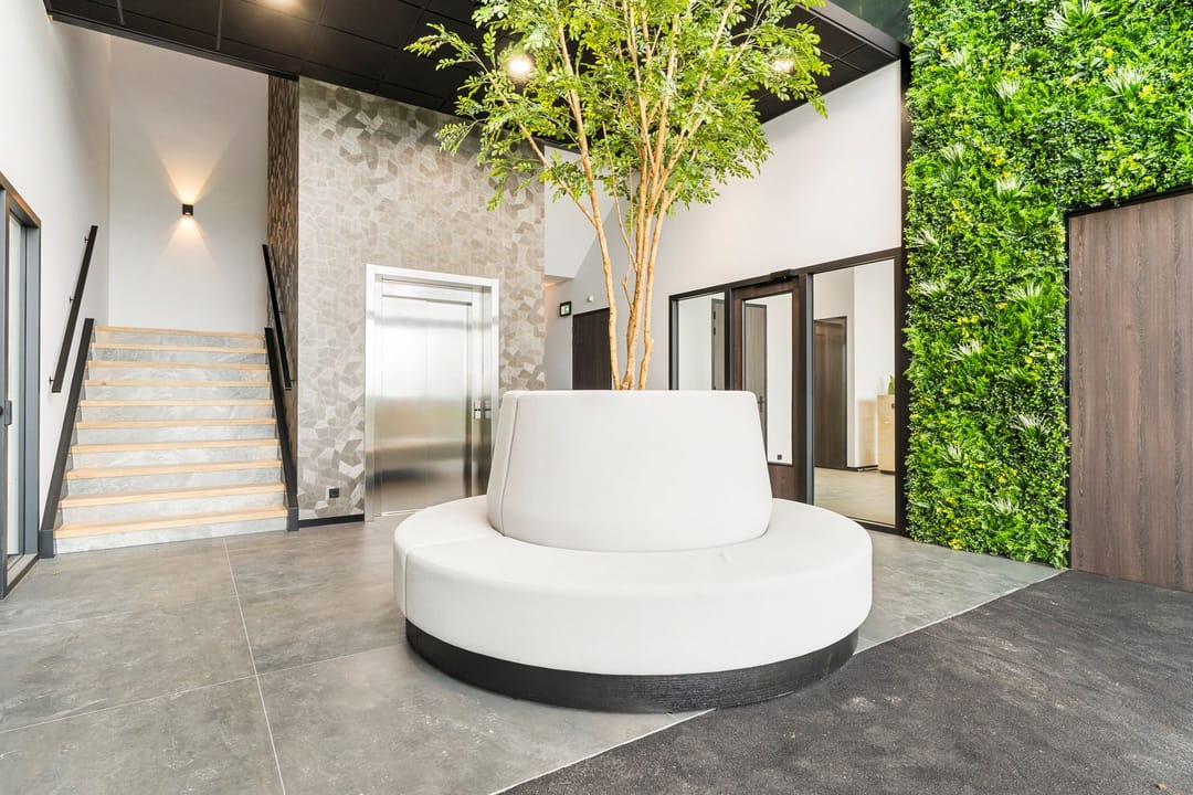 U kunt uw auto droog parkeren in de parkeergarage onder het gebouw en vervolgens bereikt u de kantoorruimte via de imposante entree met de trap of de lift.