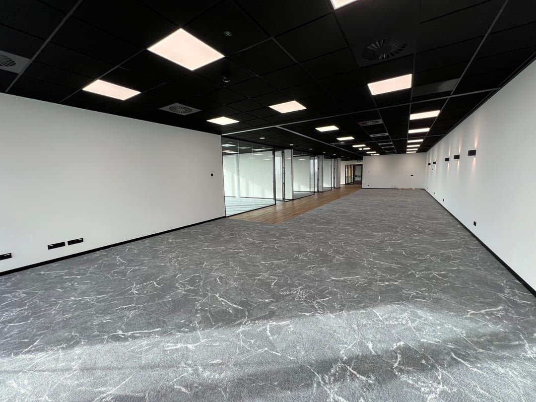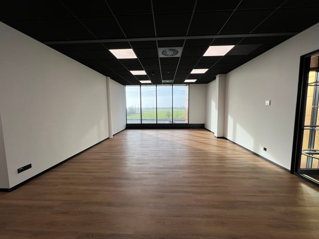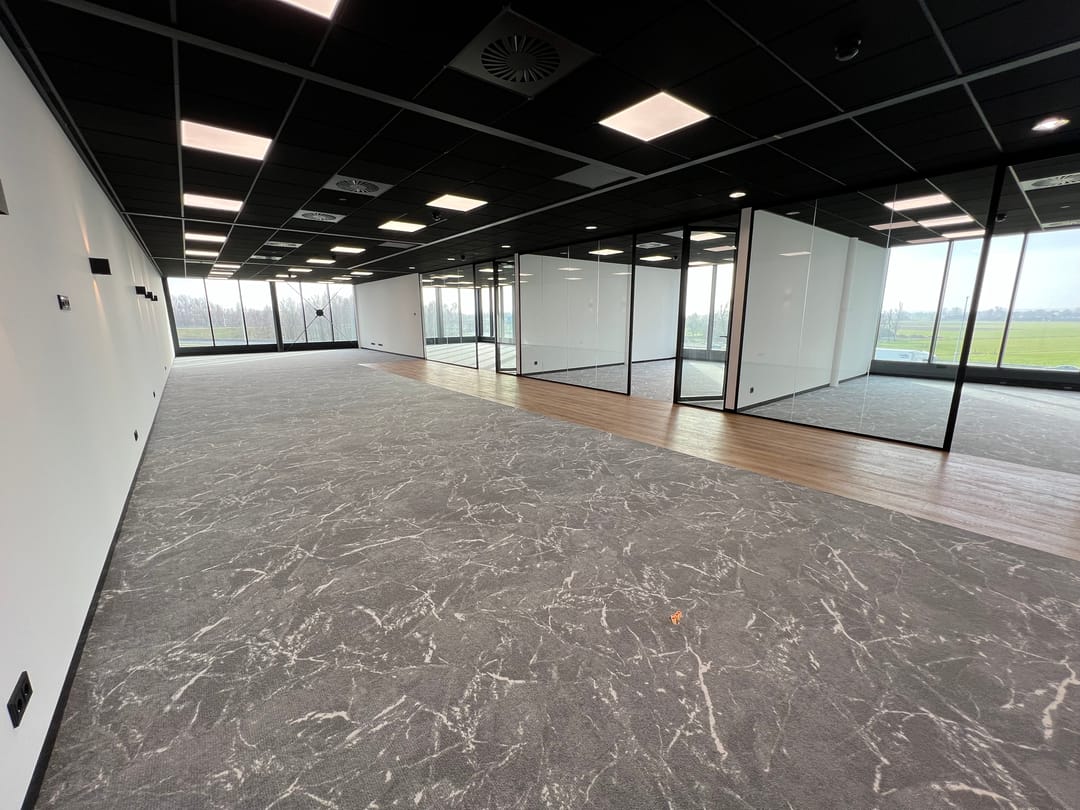 De kantoorruimte is verdeeld over twee vleugels waardoor de kantoorruimte ook geschikt is voor deelverhuur. Het opleveringsniveau is zeer hoogwaardig en turn-key met onder andere glazen wanden, zwarte systeemplafonds, airco, vloerbedekking, opbouw en inbouwverlichting, twee dubbele toiletgroepen enz. Kortom een ideale kantoorruimte op een zichtlocatie uitkijkend over de snelwegen met een zeer hoog opleveringsniveau.