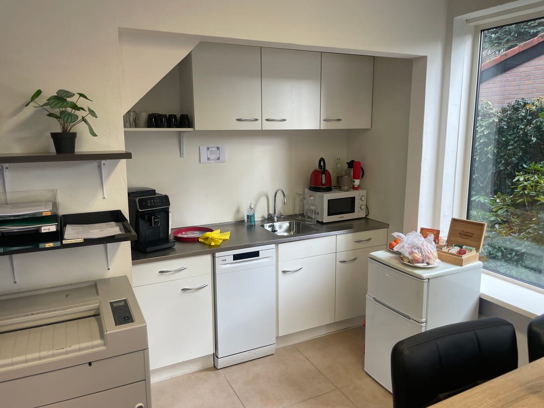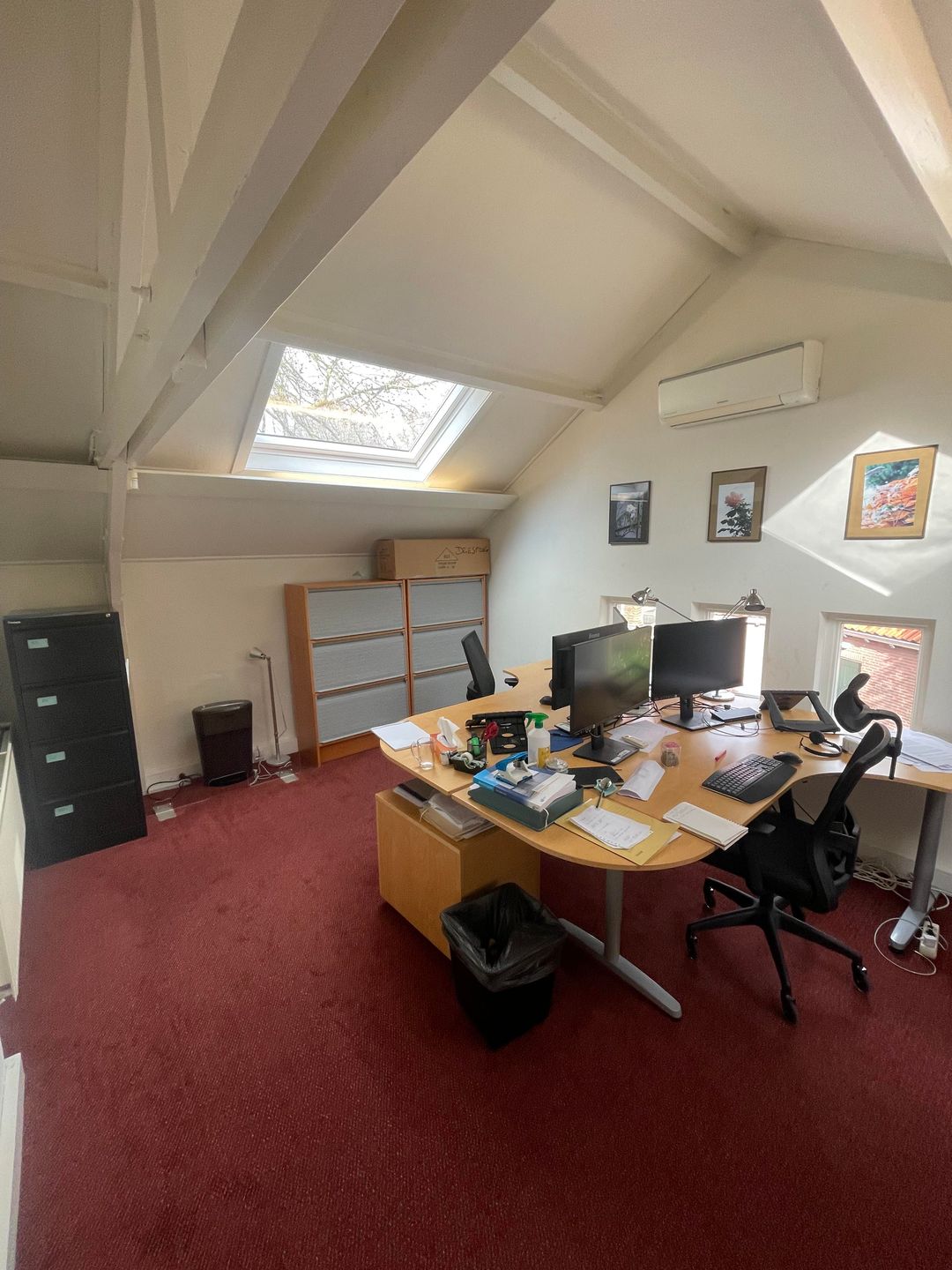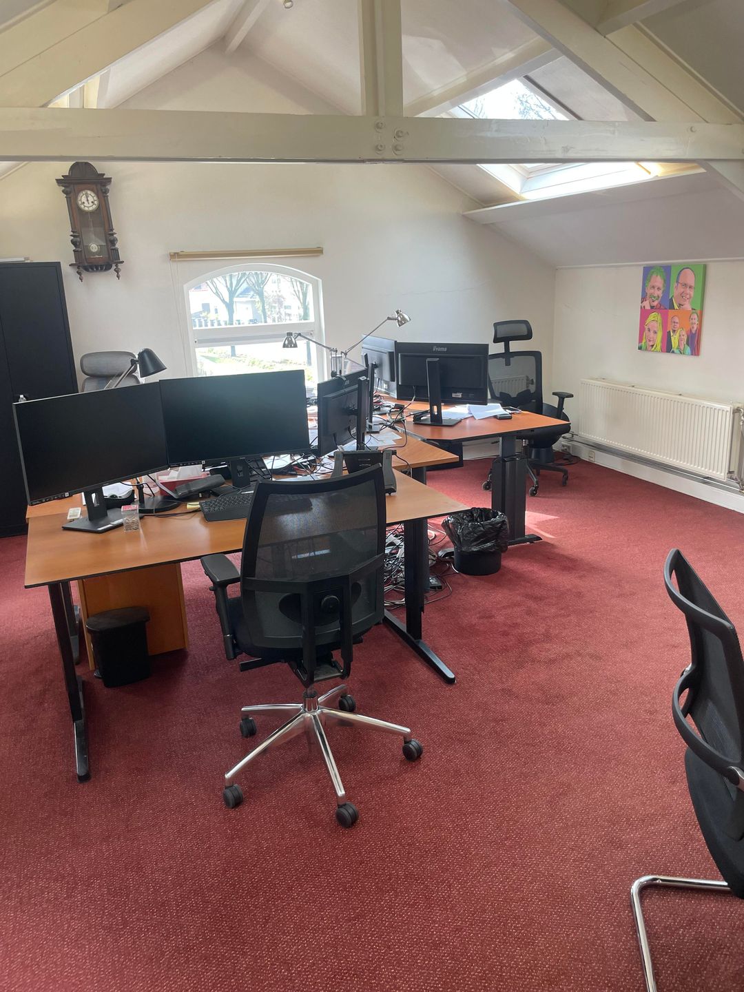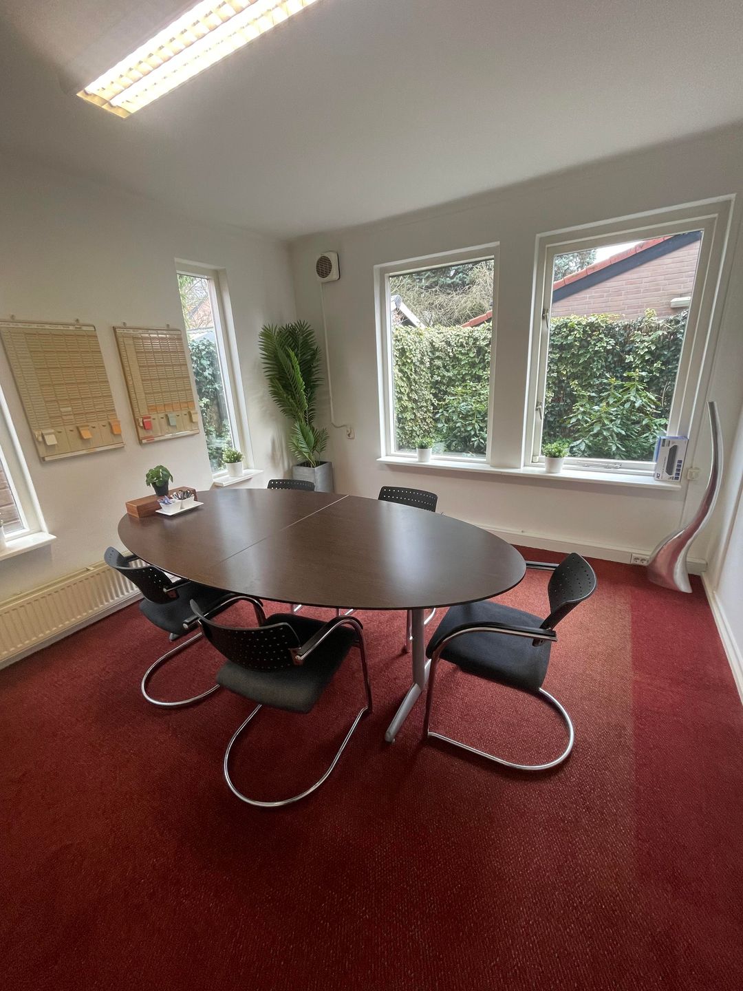 De indeling omvat een entree met garderobe, een ruime open kantoorruimte met meerdere werkplekken, een separate vergaderruimte, pantry met keukenopstelling en sanitaire voorzieningen. Op de verdieping bevinden zich twee kantoorruimtes met een open kapconstructie en daklichten, wat zorgt voor een ruimtelijk en aangenaam werkklimaat.