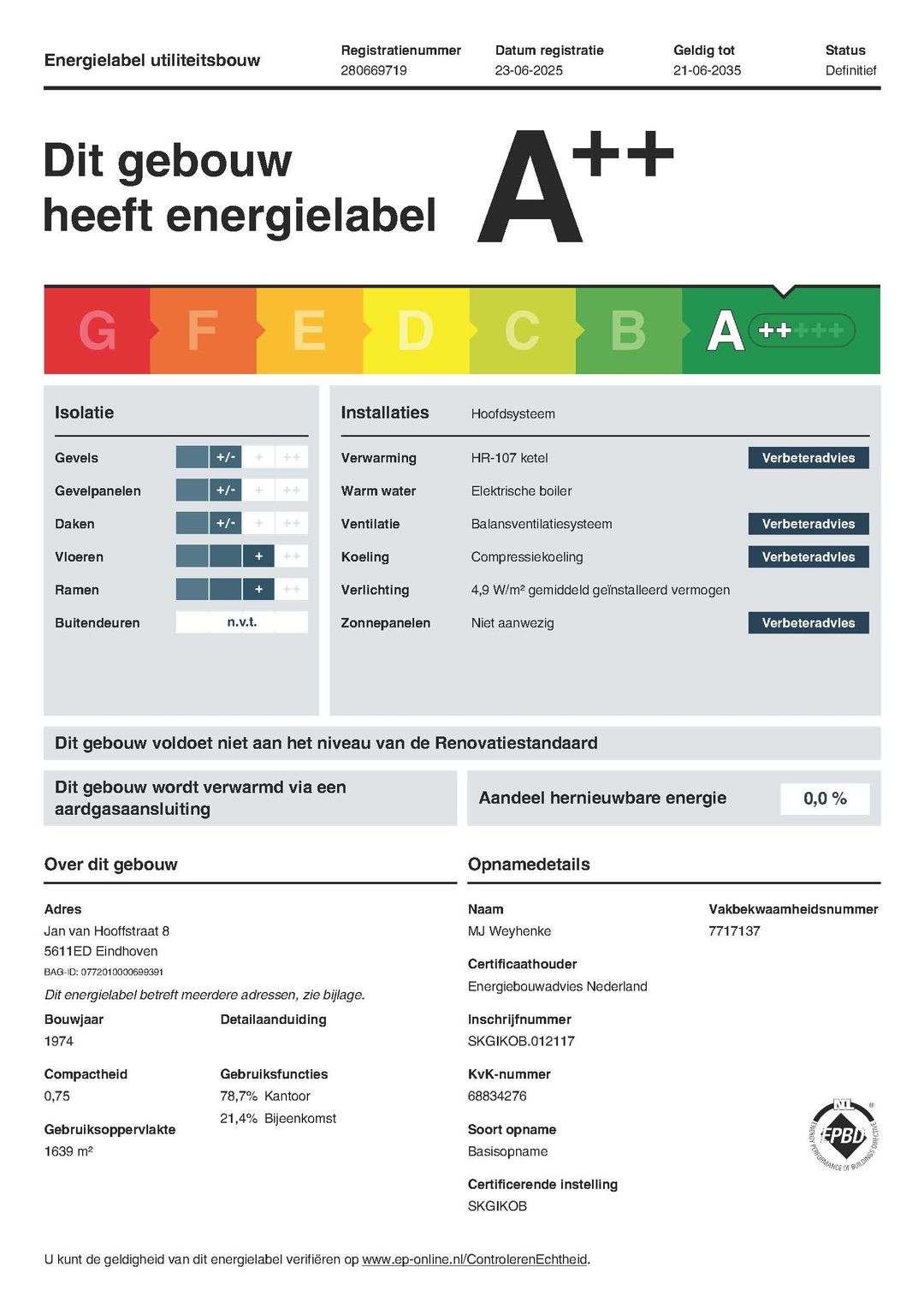 Het kantoorgebouw beschikt over het gunstige energielabel A++ welke geldig is tot 21-06-2035. Hiermee voldoet het kantoorpand reeds aan de overheidsdoelstellingen waarbij vanaf 2023 alle utiliteitsgebouwen minimaal een energielabel C dienen te hebben.