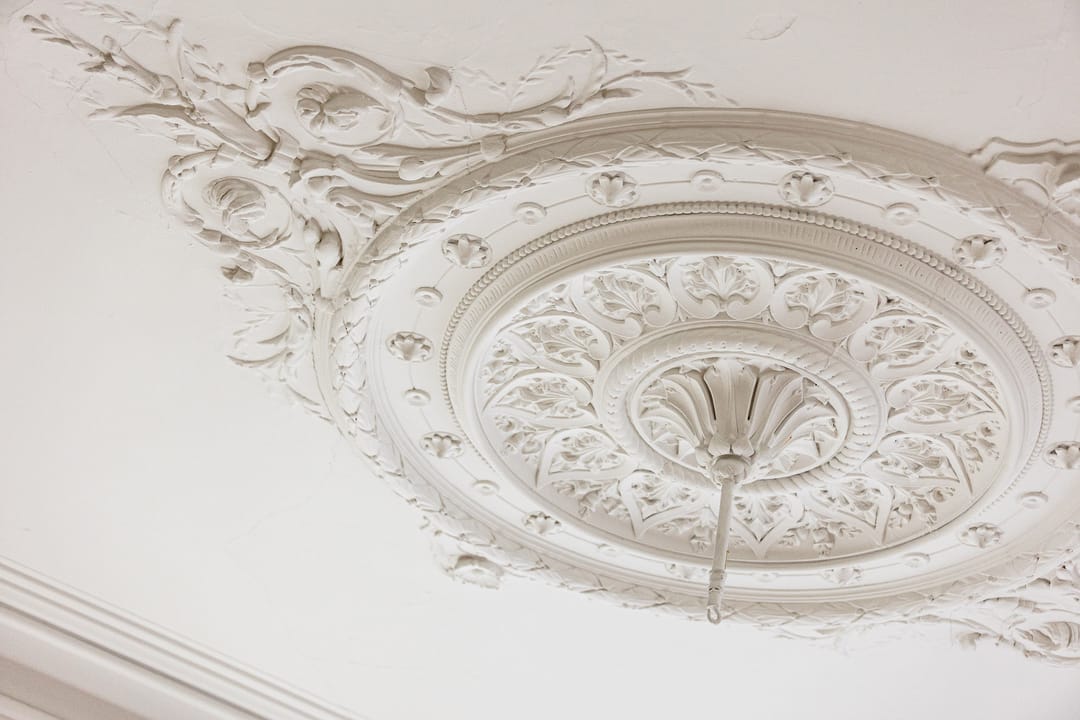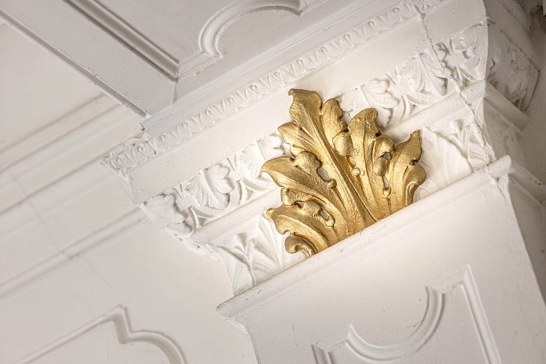 - stucwerk plafonds met ovale sierlijsten en ornamenten;