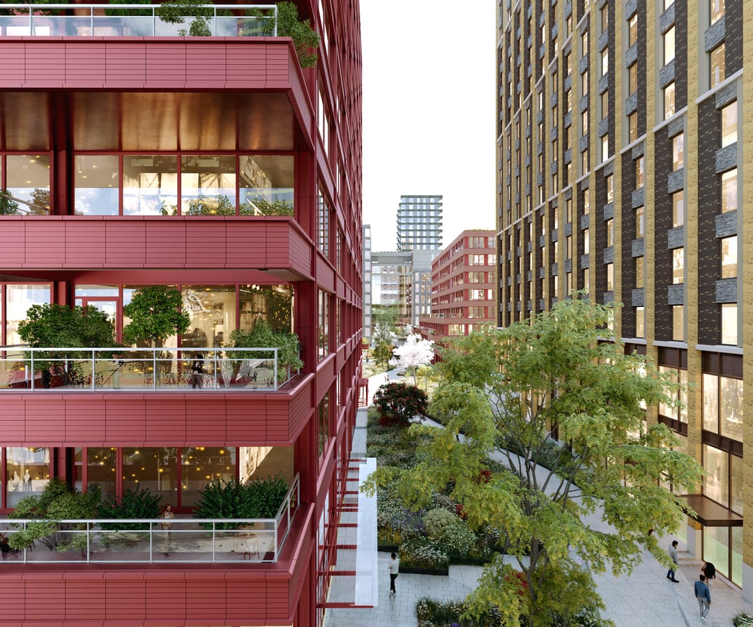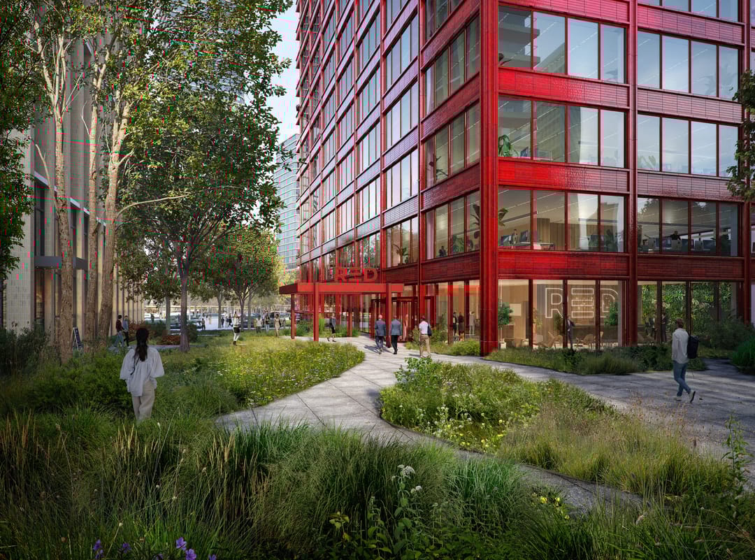 Wat The RED écht uniek maakt, is de directe toegang tot die groene buitenruimten vanaf élke verdieping. Alle balkons zijn door middel van vides visueel met elkaar verbonden. Gebruikers kunnen met laptop of tablet eenvoudig buiten werken of elkaar daar ontmoeten. Deze buitenruimtes dragen bij aan welzijn en gezondheid en versterken de visuele verbinding met de stad.