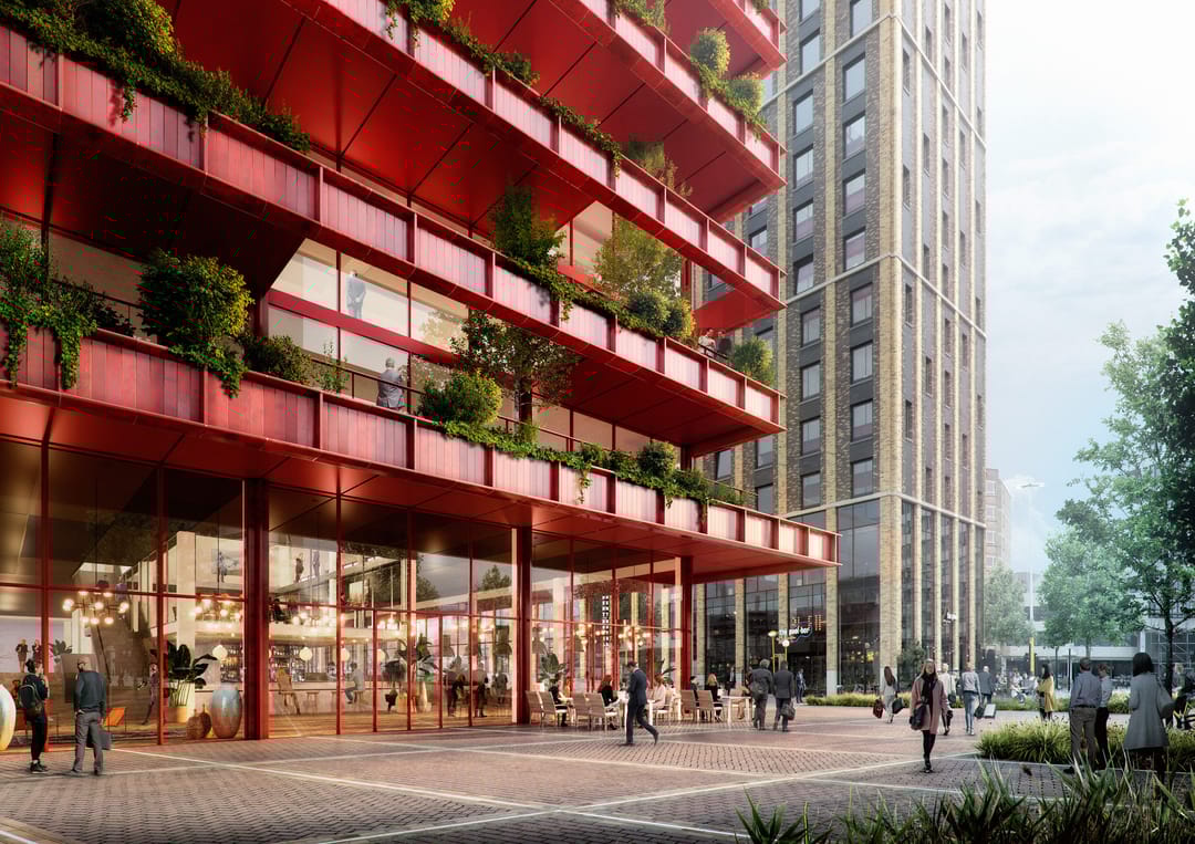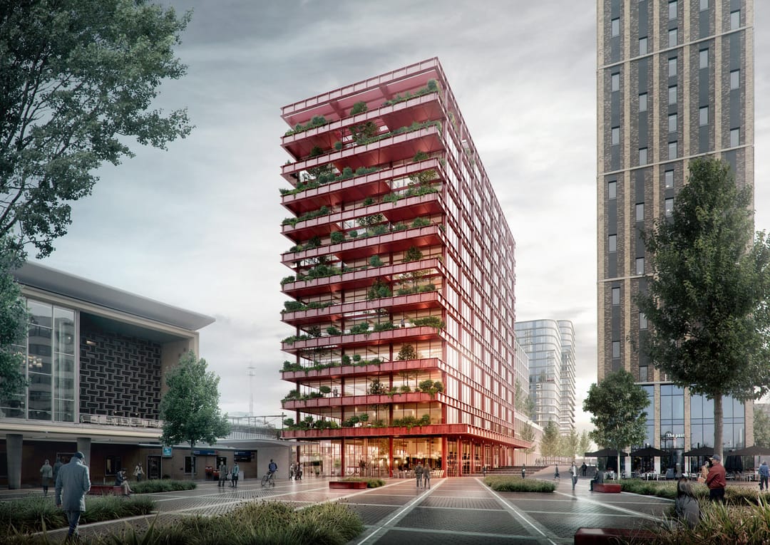 Een ontwerp van de bekende CIE Architecten uit Amsterdam geeft een indrukwekkende plint van vijf meter hoog en maakt The RED een krachtig statement richting het Stationsplein. Hier is volop ruimte voor horeca en winkels, wat bijdraagt aan een levendige sfeer op straatniveau. De bijzondere gevel is afgewerkt met geglazuurd rood keramiek – een hoogwaardige knipoog naar de iconische architectuur van Eindhoven (zoals het gebouw van De Bijenkorf) en een subtiele verwijzing naar de glimmende staalstructuren uit het industriële verleden van de stad.
