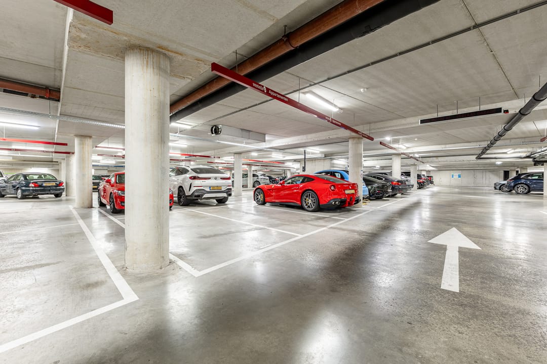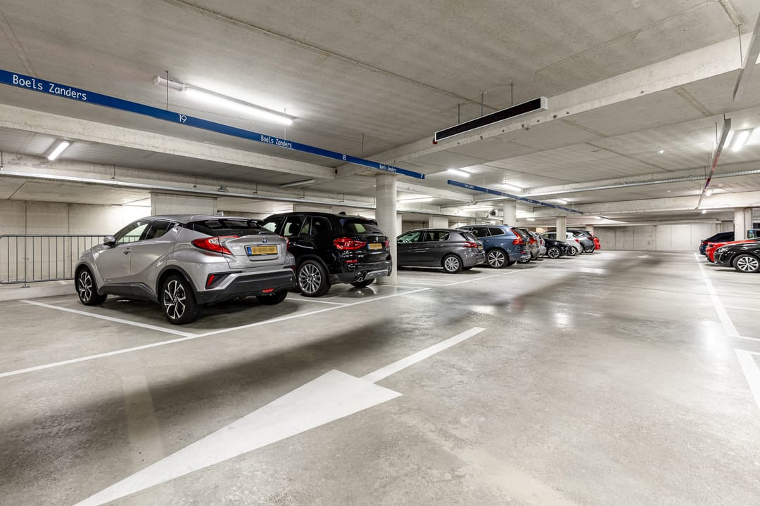 18 eigen parkeerplaatsen in de ondergelegen parkeergarage en aanvullend betaald in de directe omgeving.