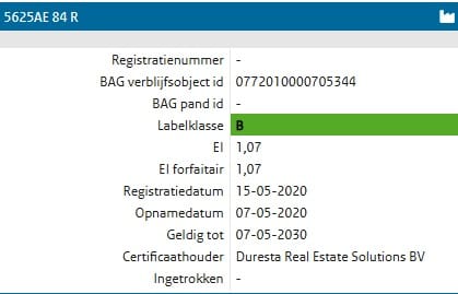Het kantoorgebouw beschikt over het gunstige energielabel B welke geldig is tot 07-05-2030.