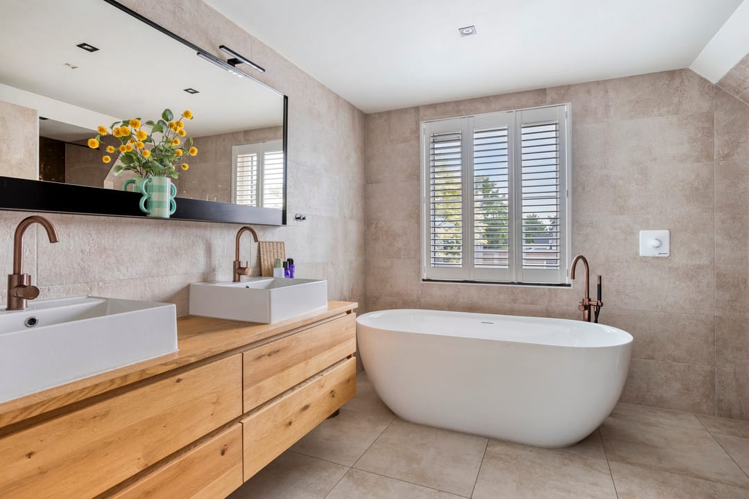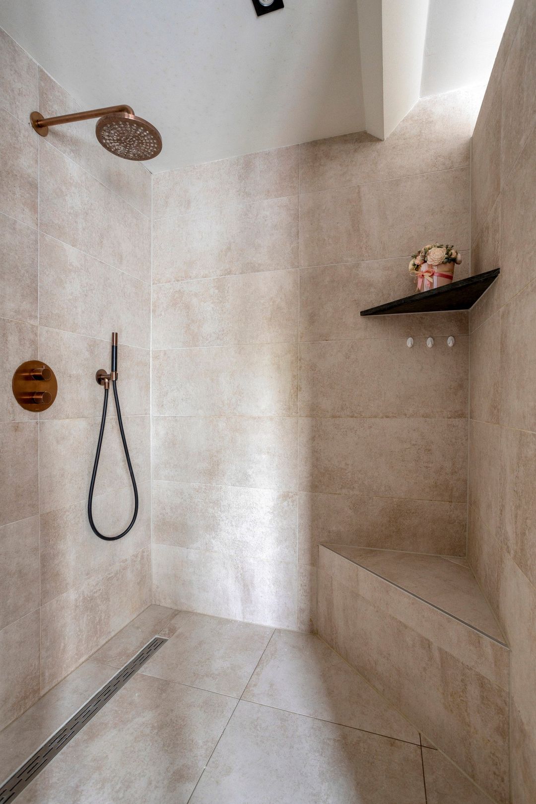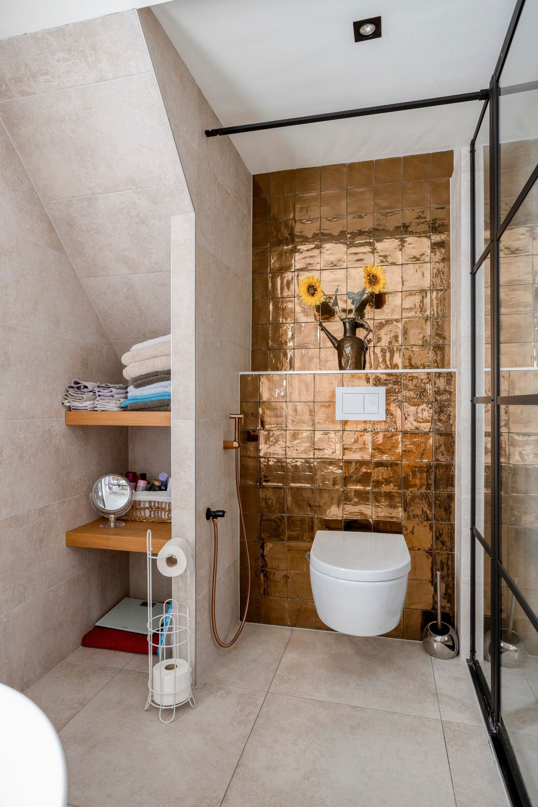 De badkamer beschikt over een dubbele wastafel met meubel, wandcloset, ligbad en een grote inloopdouche vanwege een dakkapel en wordt verwarmd door middel van vloerverwarming. Net zoals de gehele woning, is de badkamer in 2022 volledig verbouwd en vernieuwd.