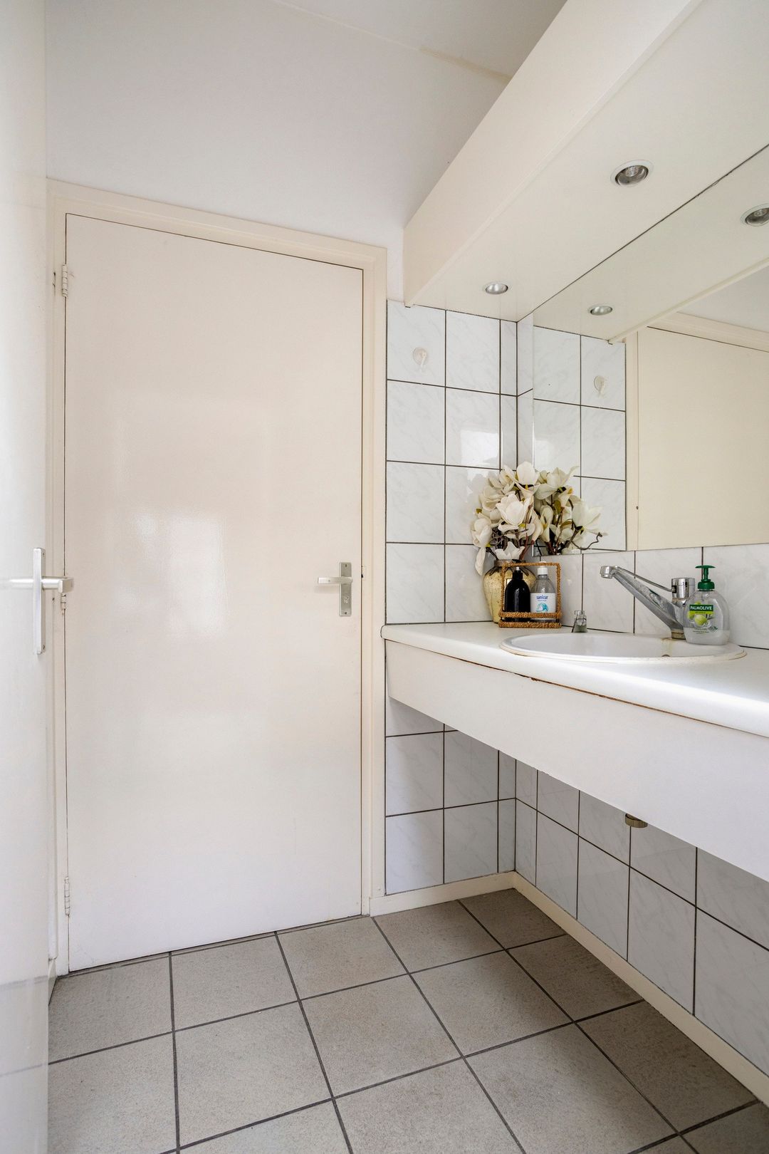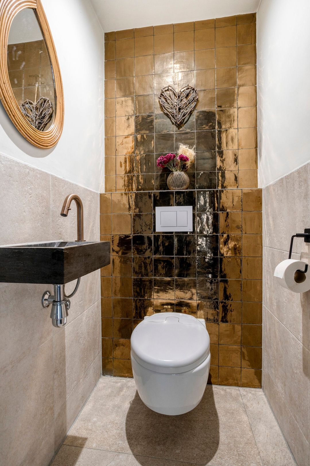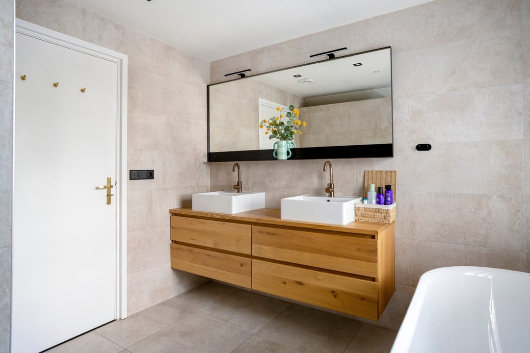 De badkamer beschikt over een dubbele wastafel met meubel, wandcloset, ligbad en een grote inloopdouche vanwege een dakkapel en wordt verwarmd door middel van vloerverwarming. Net zoals de gehele woning, is de badkamer in 2022 volledig verbouwd en vernieuwd.