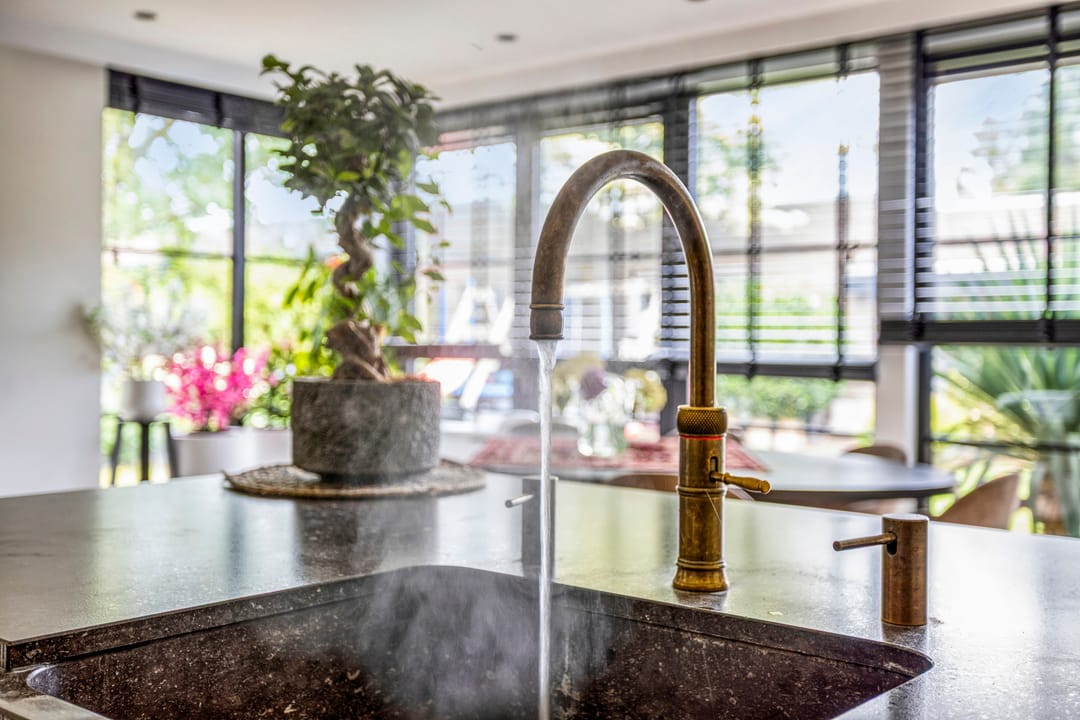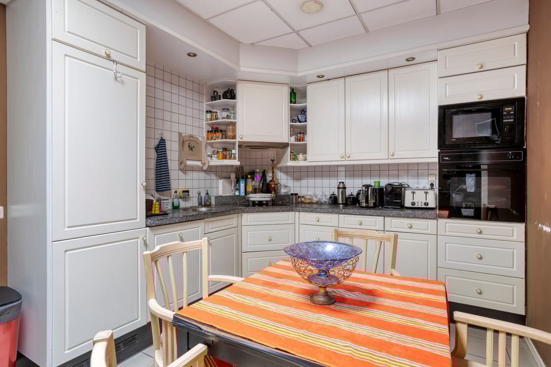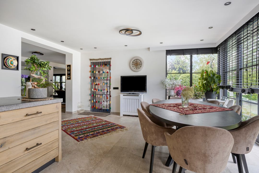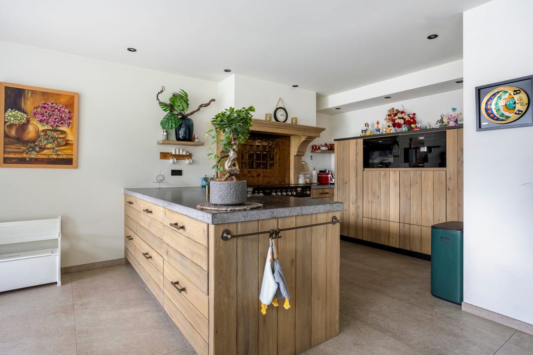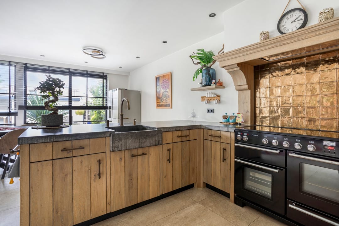 Vanuit het woongedeelte heeft u toegang tot de keuken. De keuken is uitgerust met een composiet blad in Arden blue suede en beschikt over een inductieplaat met afzuiging, spoelbak met Quooker, koelkast, vaatwasser, een gril, combi-oven, twee grote ovens en een ingebouwde koffiezetapparaat. De keuken is recent verbouwd door Thijs Keukens en daarbij is al het apparatuur ook vernieuwd (2022). Middels een losse toegangsdeur en nog een dubbele toegangsdeur heeft u toegang tot de tuin. De keuken is tijdens de verbouwing in 2022 uitgebouwd over de gehele breedte van de keuken.