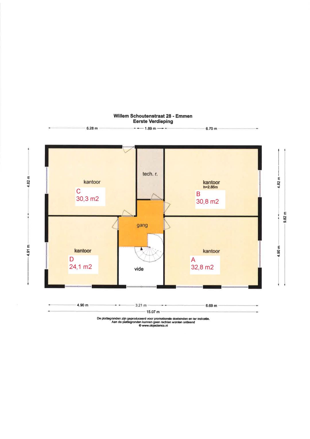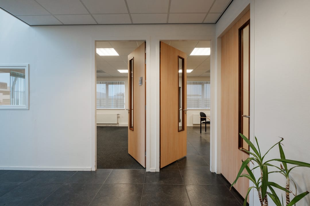 For rent OFFICE SPACES ranging from 24.1 - 30.8 m² (the total is approx. 213 m2 rentable office space and approx. 87 m3 common space in hall, canteen, toilet group and storage room), located on the Business Park Bargermeer-Zuid in Emmen.