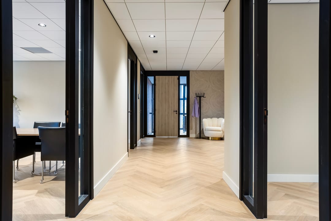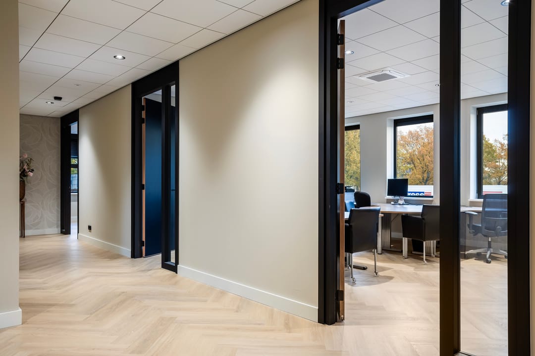 entree, gang en 3 ruime kantoren. De keuken, dames-/ en herentoilet en technische ruimte zijn voor gezamenlijk gebruik.