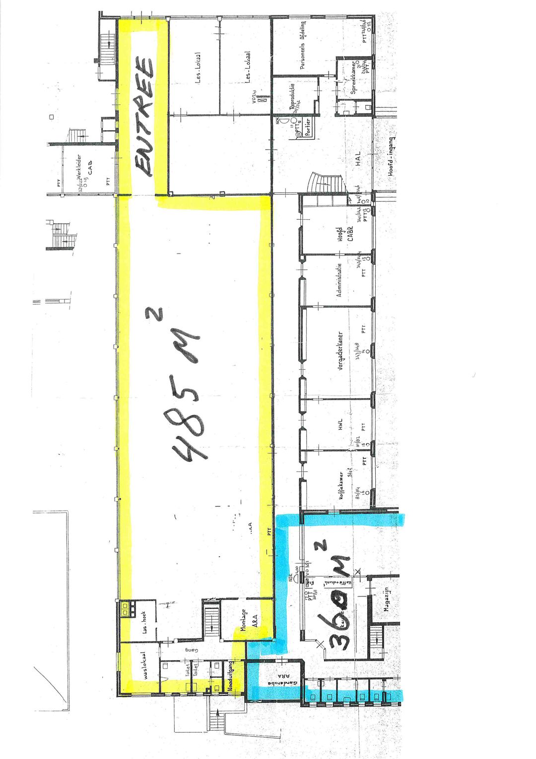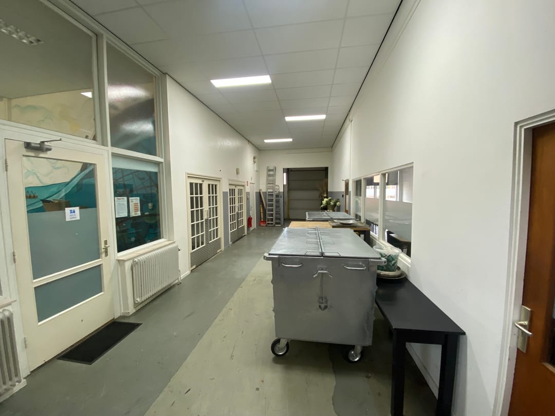 Kantoorruimte: entree, hal, kantoren, kantine, archief, toiletgroep met invalidentoilet (VERHUURD).