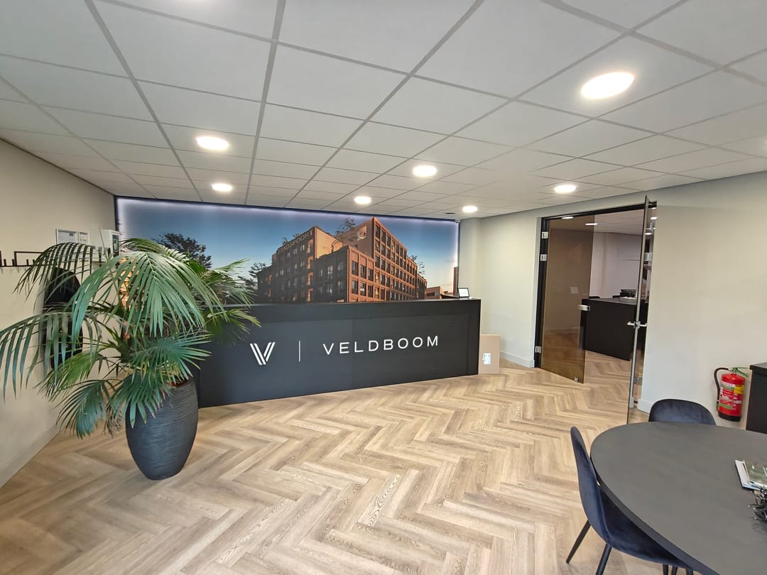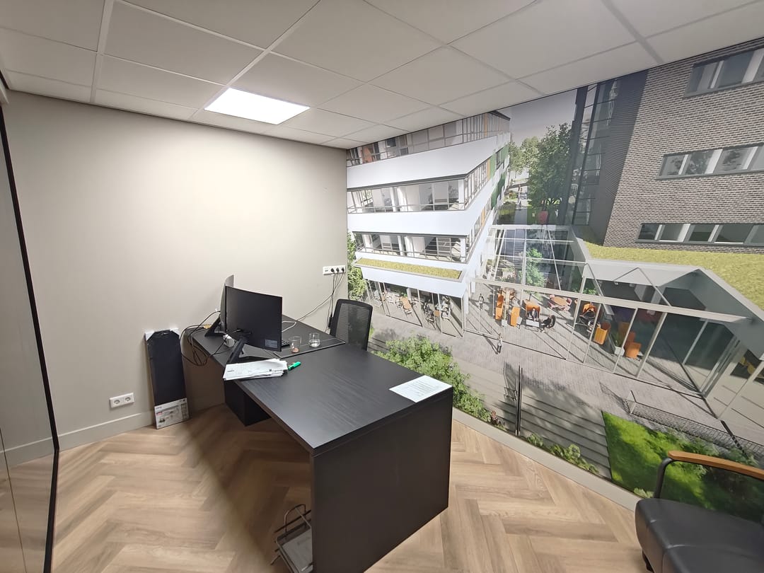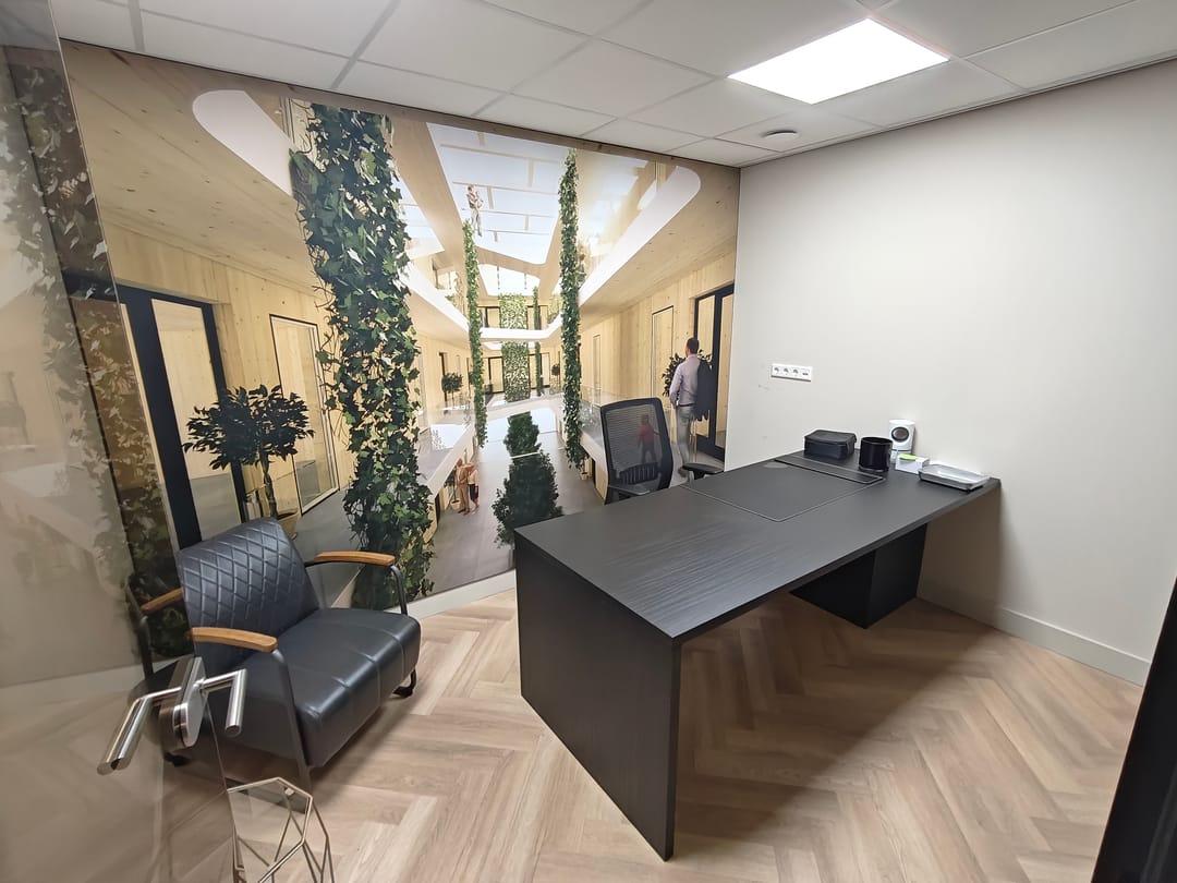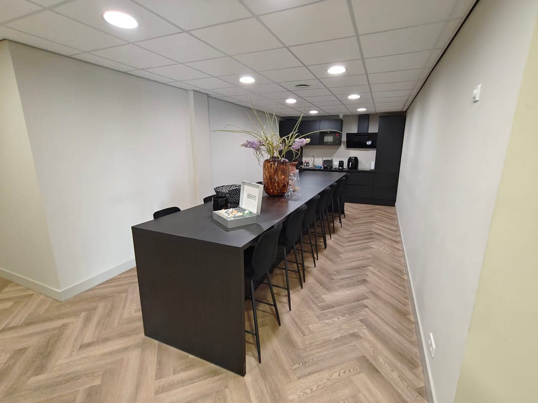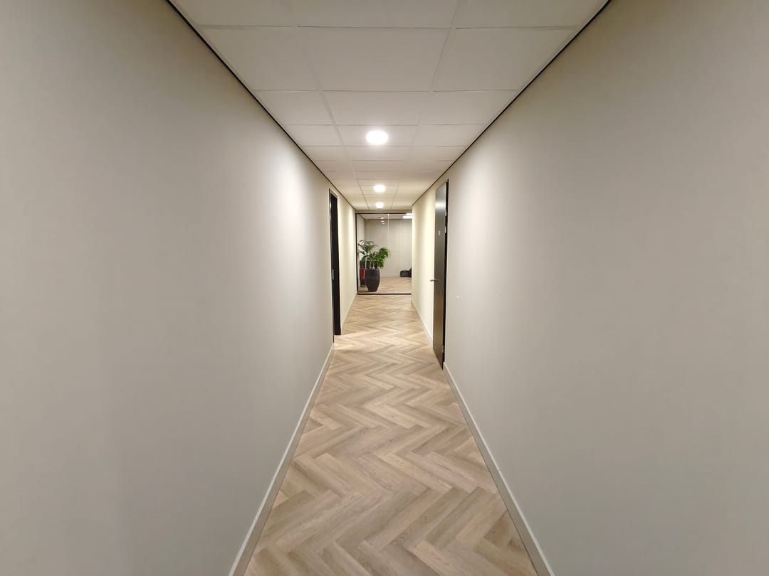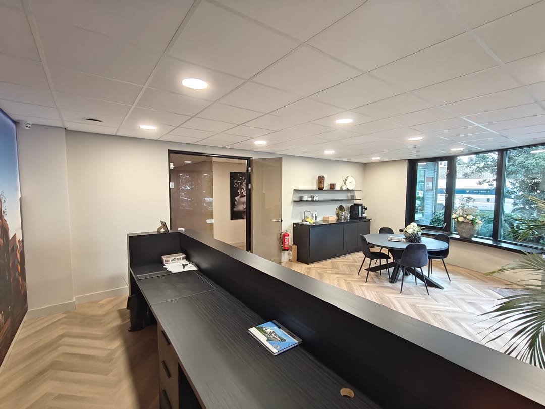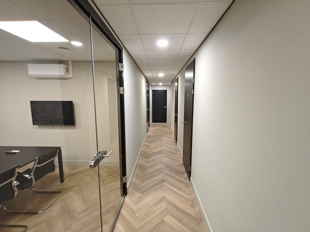 Entreedeur naar de receptie, vanuit hier zijn de verschillende kantoorruimtes, pantry en sanitaire voorzieningen te bereiken.