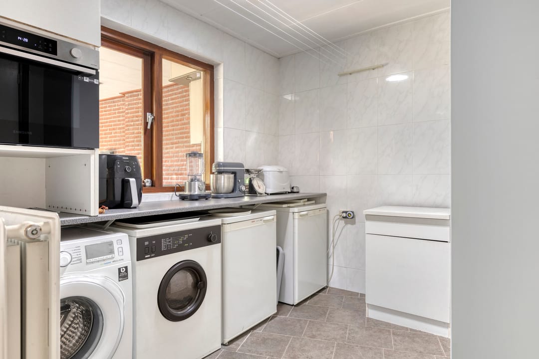De garage en berging zijn zowel vanuit het kantoor als vanaf de straat bereikbaar. De garage heeft elektrisch bedienbare deuren, zodat je altijd droog binnenkomt. Vanuit de keuken en de serre heb je toegang tot de bijkeuken met aansluitingen voor wasmachine en droger en ruimte voor twee tafelmodel diepvriezers. De van binnenuit bereikbare overkapping biedt zowel op zonnige als regenachtige dagen een fijne buitenplek.
