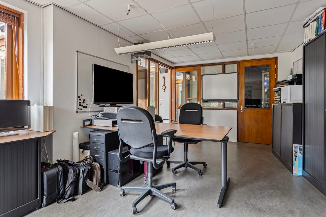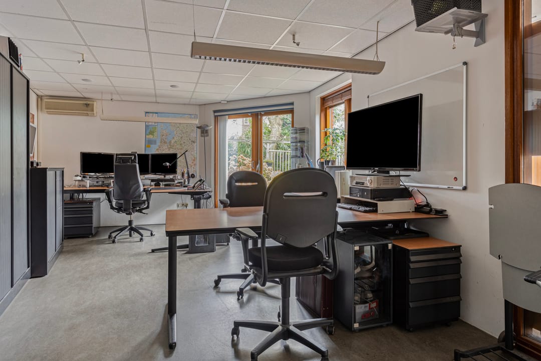 De serre aan de achterzijde, met openslaande tuindeuren, biedt ruimte voor een royale eettafel, ideaal voor familiebijeenkomsten. Vanuit de serre bereik je de kantoorruimte van circa 27 m², die ook airconditioning heeft en via tuindeuren toegankelijk is. Deze ruimte kan gemakkelijk worden omgevormd tot een vijfde slaapkamer. De begane grond is vrijwel geheel drempelloos.