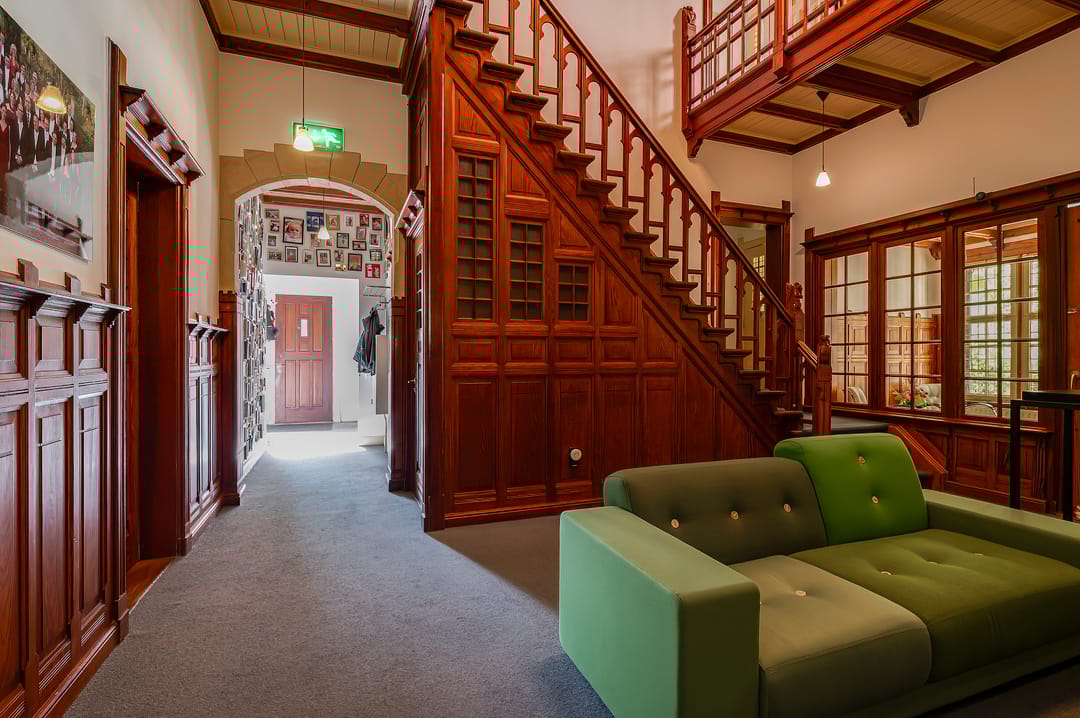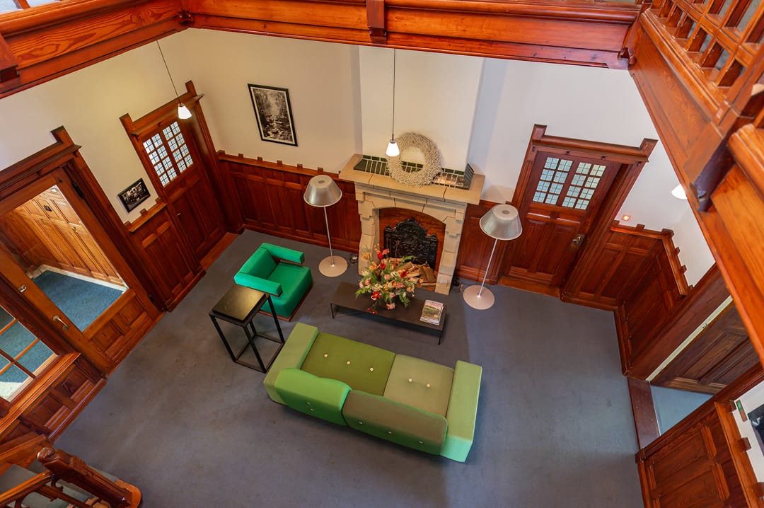 De voorname entree (vestibule) bevindt zich aan de zijkant en is rijk gedecoreerd met houten lambrisering en glas in lood partijen. De statige grote centrale hal strekt zich uit over 2 bouwlagen en biedt ruimte aan de oorspronkelijke schouw. Alle deuren welke aan de hal grenzen hebben nog een oorspronkelijk karakter en kenmerken zich door de decoratieve houten omlijsting. Rondom de centrale hal zijn 4 kantoren gegroepeerd waarvan 2 toegang bieden tot 2 separate serres. Verder biedt de begane grond ruimte aan een dubbele toiletgroep, keuken, achter entree en toegang tot een bergruimte in de kelder. In deze kamer bevindt zich de centrale afzuigunit van het centraal stofzuigsysteem dat in het pand aanwezig is.