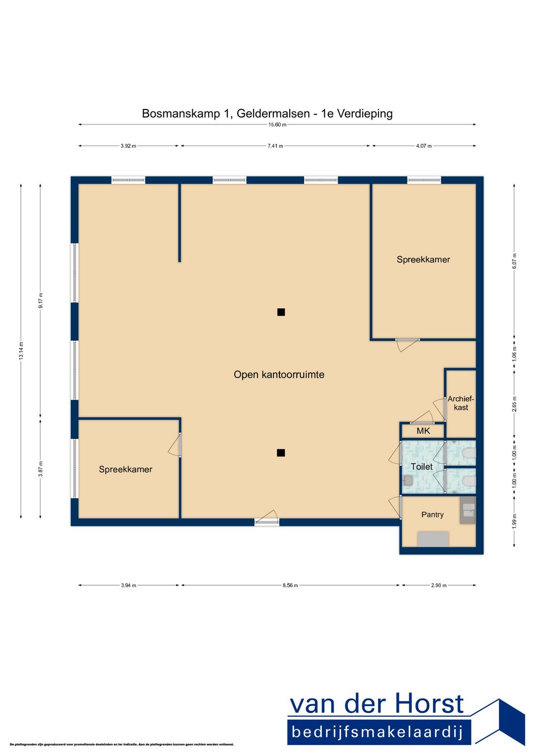 De door Van der Horst Bedrijfsmakelaardij en verhuurder verstrekte informatie dient uitsluitend te worden gezien als een uitnodiging tot nader overleg. Hoewel de informatie met de grootst mogelijke zorg is samengesteld wordt noch door de makelaar, noch door diens opdrachtgever, ingestaan c.q. aansprakelijkheid aanvaard voor de juistheid dan wel volledigheid van de verstrekte, nog te verstrekken of vermelde gegevens. Aan afwijkingen in de tekst, maten en tekeningen kunnen dan ook geen rechten worden ontleend.