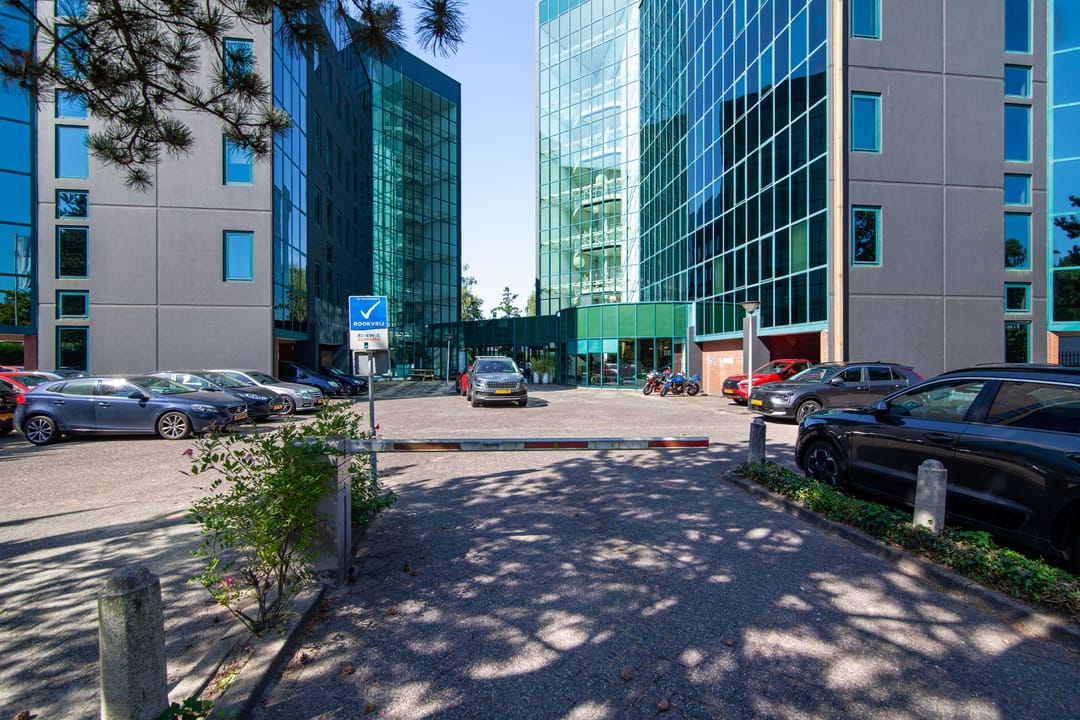 Er zijn parkeerplaatsen op eigen terrein en het parkeerterrein is afgesloten middels een slagboom en een schuifpoort.