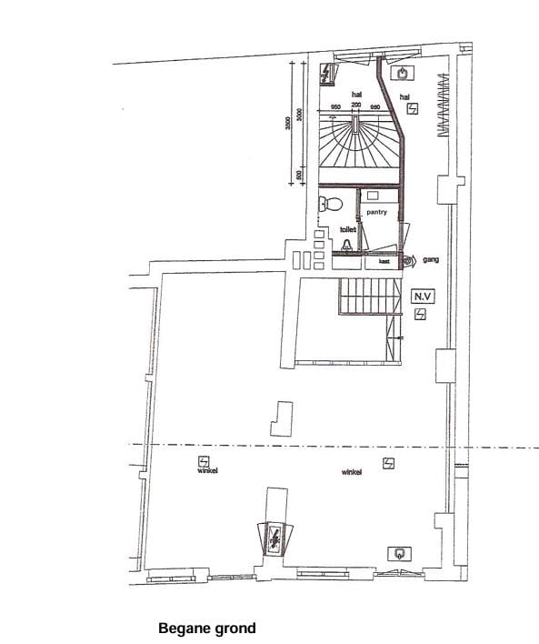 Entree, open kantoor-/ winkelruimte met vide boven de trap met mogelijkheid voor een pantry. gang met open (goed beloopbare) trap naar de kelder, meterkast. Toiletruimte met toilet en urinoir. Pantry met elektrische boiler. Werkkast met uitstortgootsteentje. CV-ketel bij de achteringang. Bevoorrading kan onder meer via de achteringang plaatsvinden.