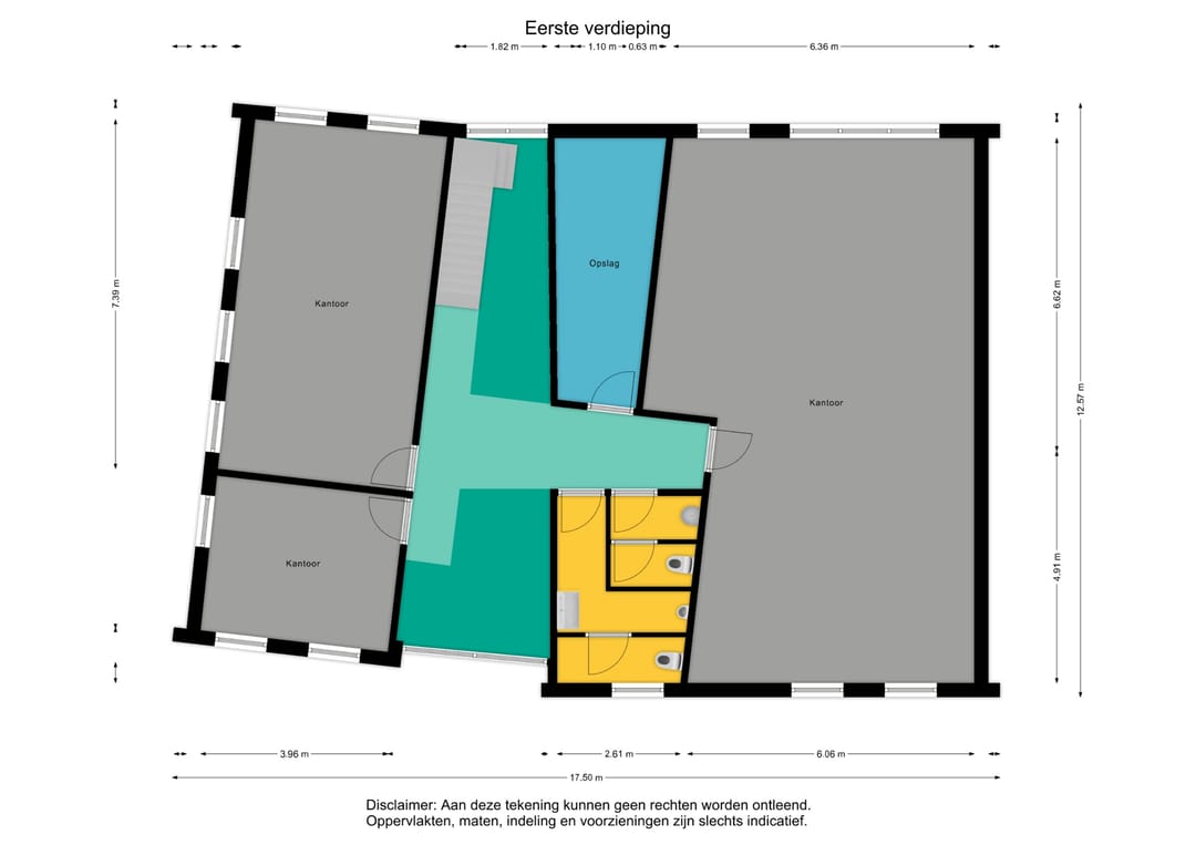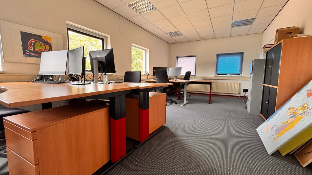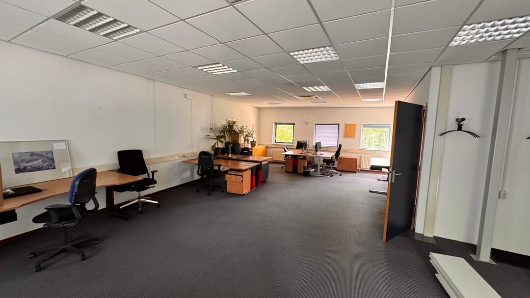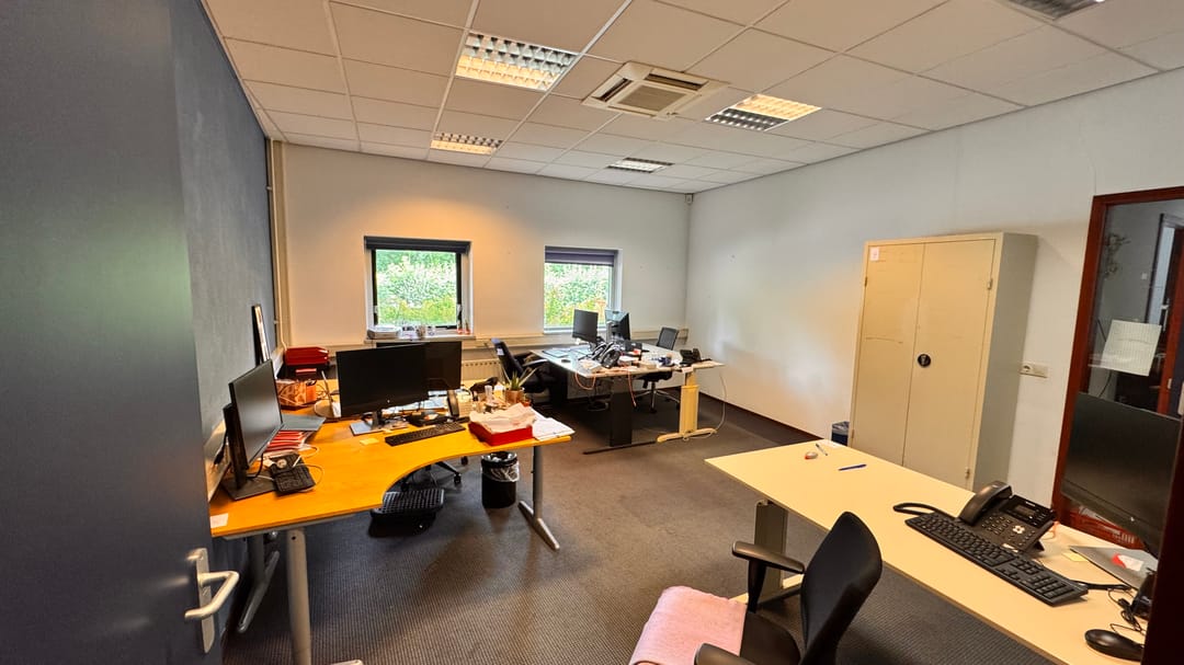 Verdieping: (circa 170m2) open vide met toiletgroep en doucheruimte. Diverse kantoorvertrekken.