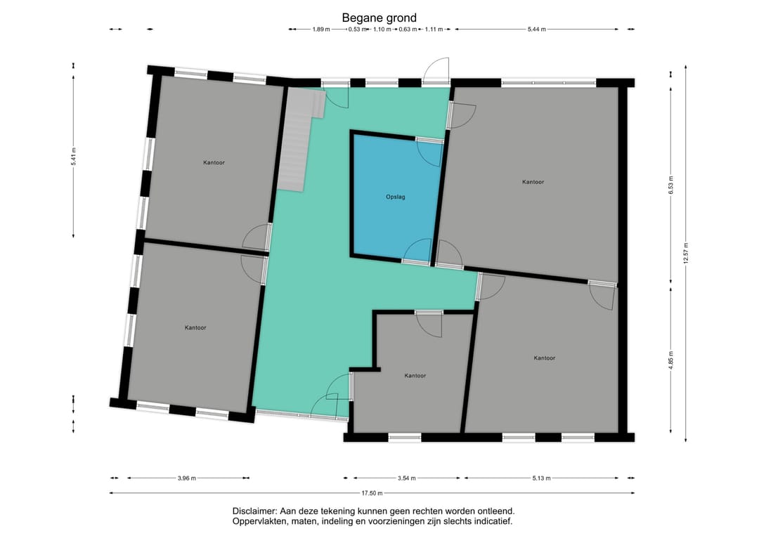 Begane grond: (circa 180 m2) portaal, royaal entreegebied met receptieruimte en balie. Hier is de open trap naar de verdieping gesitueerd. Diverse kantoorvertrekken en spreekkamers. Achteringang naar parkeerterrein.