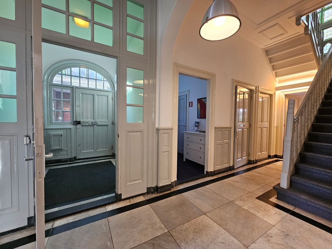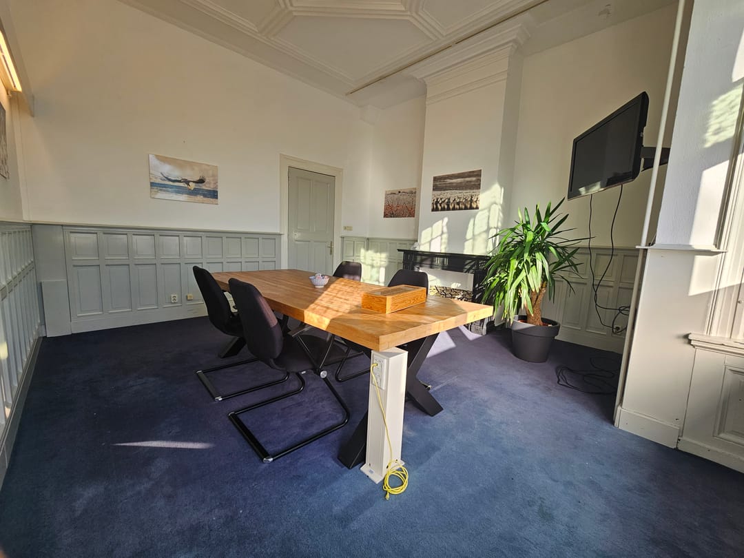 De ruimte combineren klassieke details met modern comfort — ideaal voor ondernemers die een representatieve werkplek zoeken.