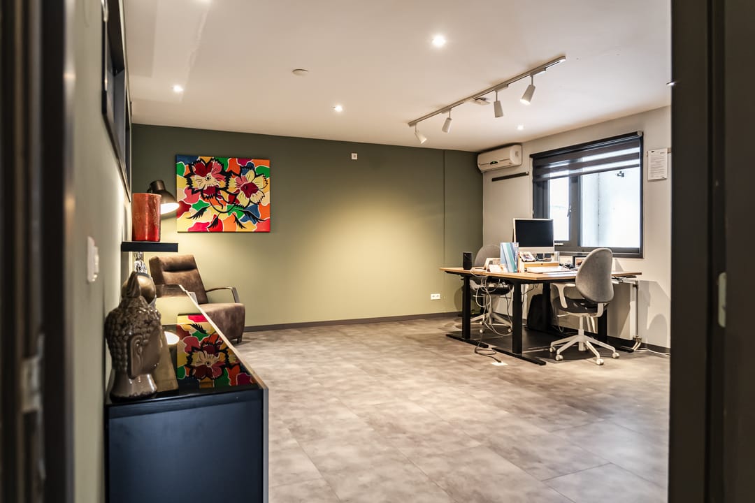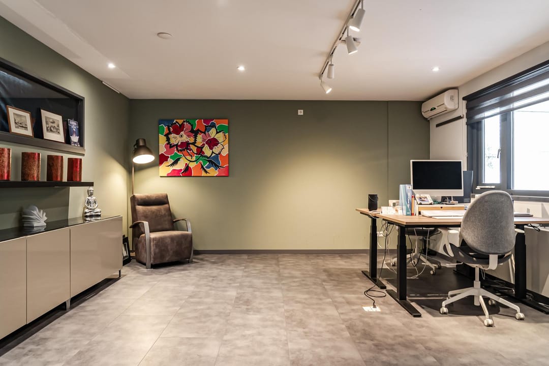 Begane grond: Entree, hal met toegang tot de eerste etage, garderobekast, bibliotheek, keuken voorzien van 2 pits inductie kookplaat, ijskast en combi-oven, twee toiletten met fontein, royale kast en werkkamer met airco. Twee nog te ontsluiten studio’s Alle ruimten hebben een onafhankelijke temperatuur regeling.