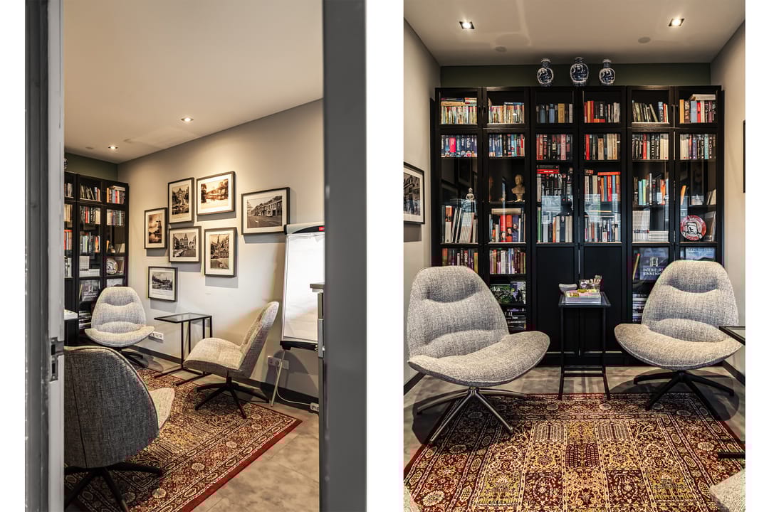 Diverse kantoorruimte/ bedrijfsruimte met o.a. bibliotheek, keuken, toilet groep en berging