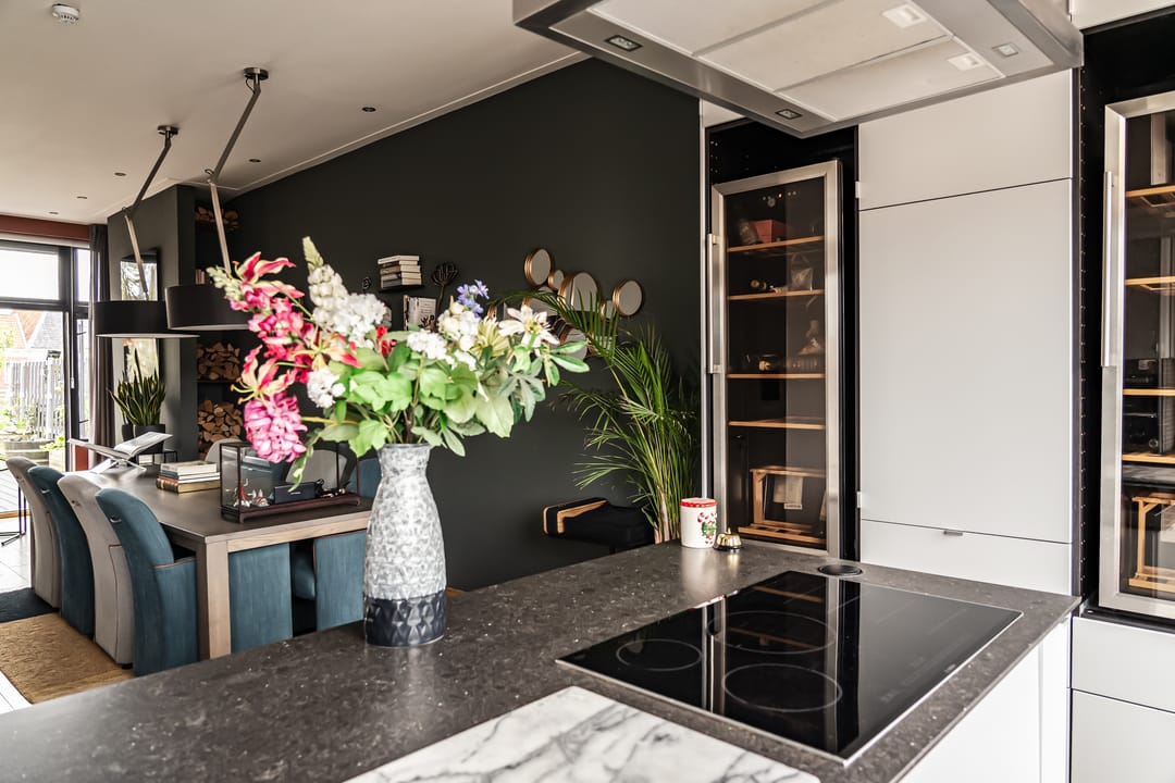 Eerste etage: Overloop, toilet met fontein, vaste kast met cv-installatie en domotica installatie, royale woonkamer met open keuken voorzien van kookeiland met inductie 5 pits, met flexzone, kookplaat (Bosch) verzonken 3 weg stekkerdoos, vaatwasser (Ikea) en afzuigkap (Bosch), combi-oven (Bosch), warmhoudlade (Bosch), Quooker met warm en bruisend water, ruime koel/vries combinatie (Bosch), twee wijnklimaatkasten (Hoover). De gehele etage heeft vloerverwarming en voor de gezellige winteravonden is er een openhaard gesitueerd in de huidige woonkamer.