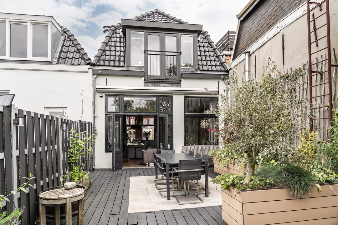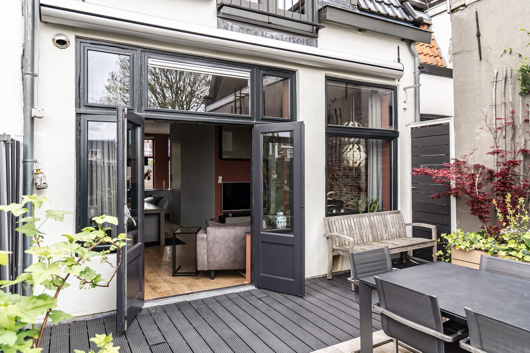 Middels de openslaande deuren betreed je het balkon. Boven de openslaande deuren hangt een elektrisch bedienbaar zonnescherm.