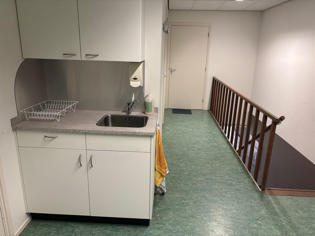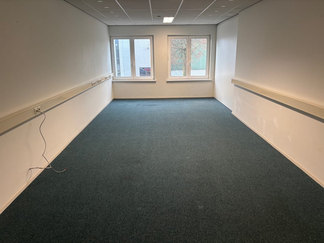 De kantoorruimte is voorzien van vloerbedekking en een systeemplafond met inbouw TL-verlichting.