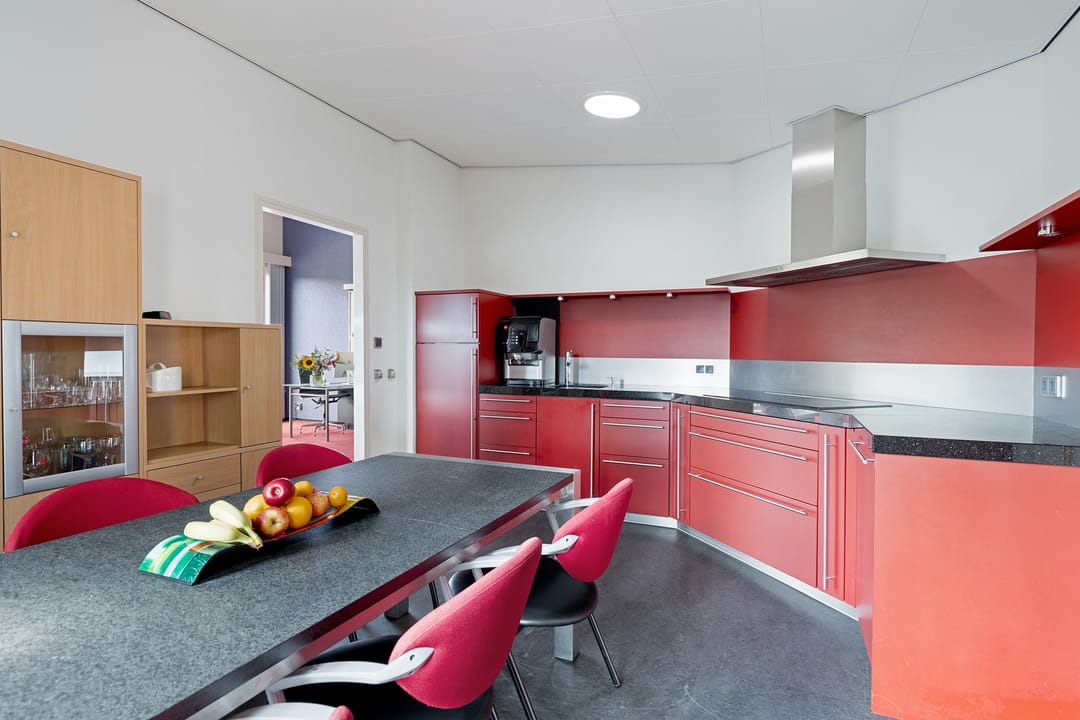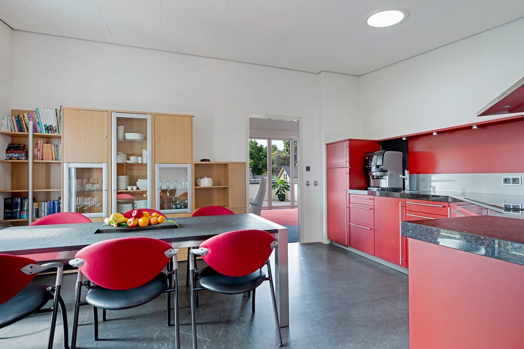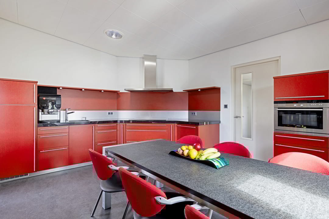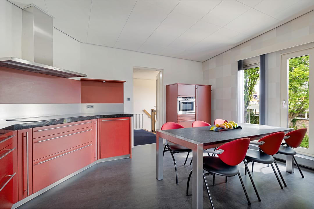 De keuken is er één die opvalt! Met zijn warmrode fronten is de keuken een ware blikvanger in de moderne stijl. Dankzij de hoekopstelling is er volop werk- en kastruimte, waardoor koken hier zowel praktisch als plezierig is. Het donkere werkblad geeft een luxe uitstraling en vormt een mooi contrast met de kastenwand. De keuken is voorzien van diverse inbouwapparatuur, waaronder een vijfpits inductiekookplaat met afzuigkap, combimagnetron en koel-vriescombinatie.
