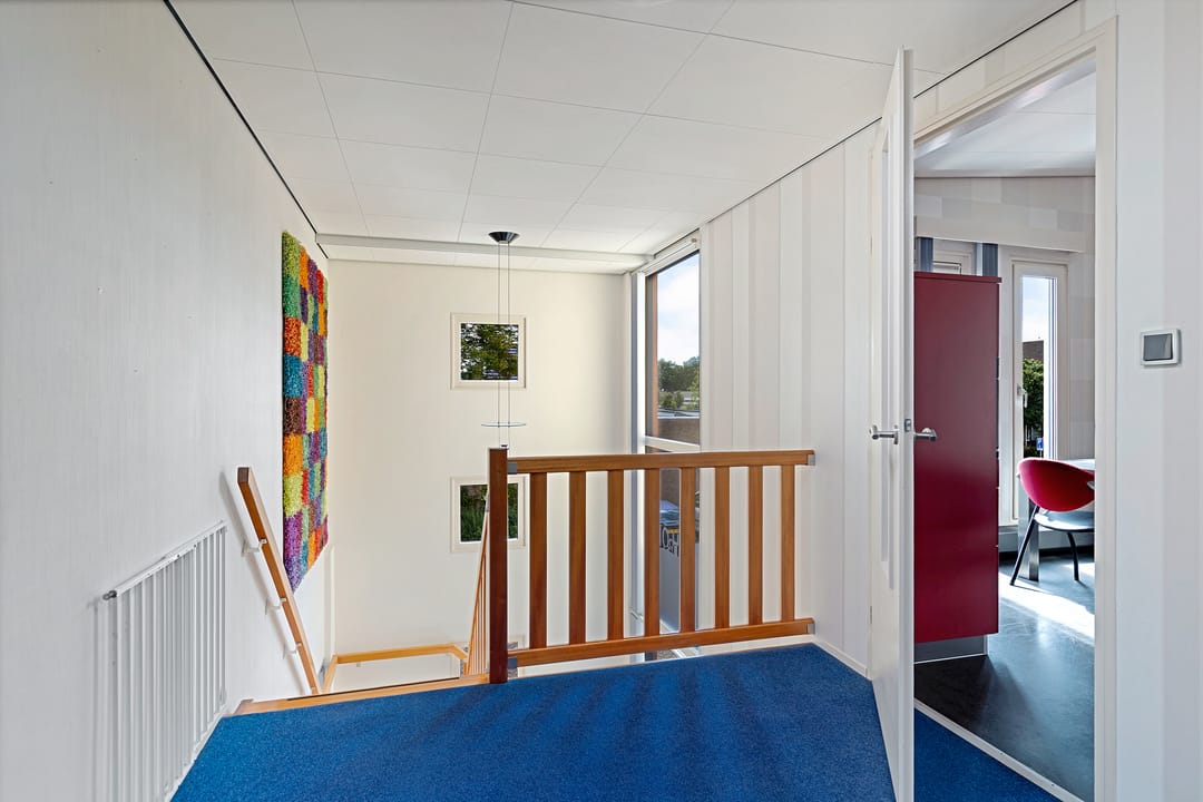 De hal op de eerste verdieping verrast door de ruimtelijke beleving en de vele toegangsdeuren. Op deze verdieping vind je alles wat je van een ruime, comfortabele woning mag verwachten, zowel het woongedeelte als maar liefst vijf slaapkamers. Dankzij de vele inbouwkasten is er volop bergruimte aanwezig.