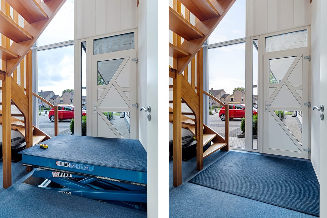 In de entree op de begane grond bevindt zich de trap naar de bovenwoning. Ook is hier een goederenlift aanwezig, subtiel weggewerkt onder de deurmat – een bijzonder praktisch detail.