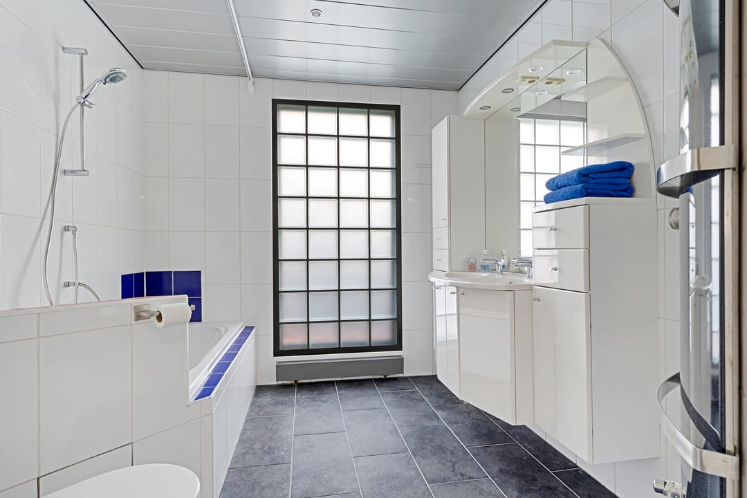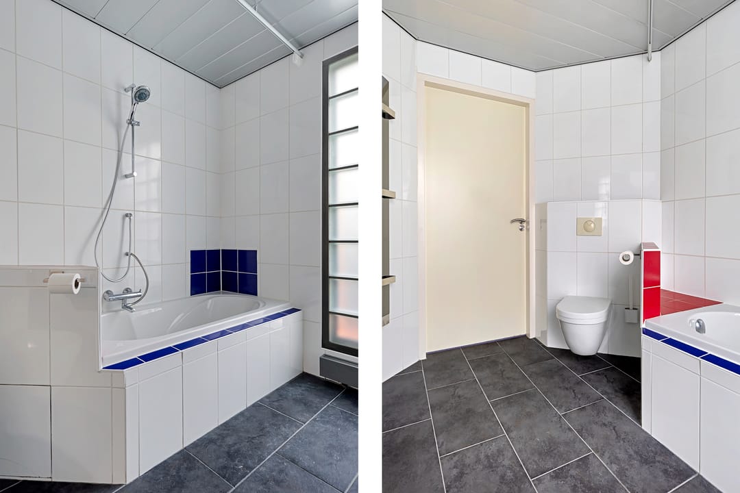 De badkamer is compleet en voorzien van een ligbad, douche, wastafelmeubel en toilet. Een bijkomend voordeel is het separate toilet in de hal.