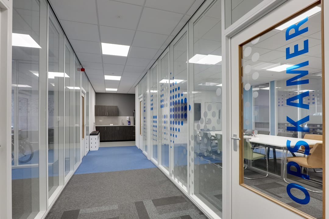 De showroom is gelegen aan de rechterzijde van het complex. Deze zeer modern uitgeruste ruimte zou eveneens als kantoorruimte ingericht kunnen worden. De kantoren op de eerste verdieping zijn voorzien van luxe spreekruimtes, een vergaderruimte en een pantry.