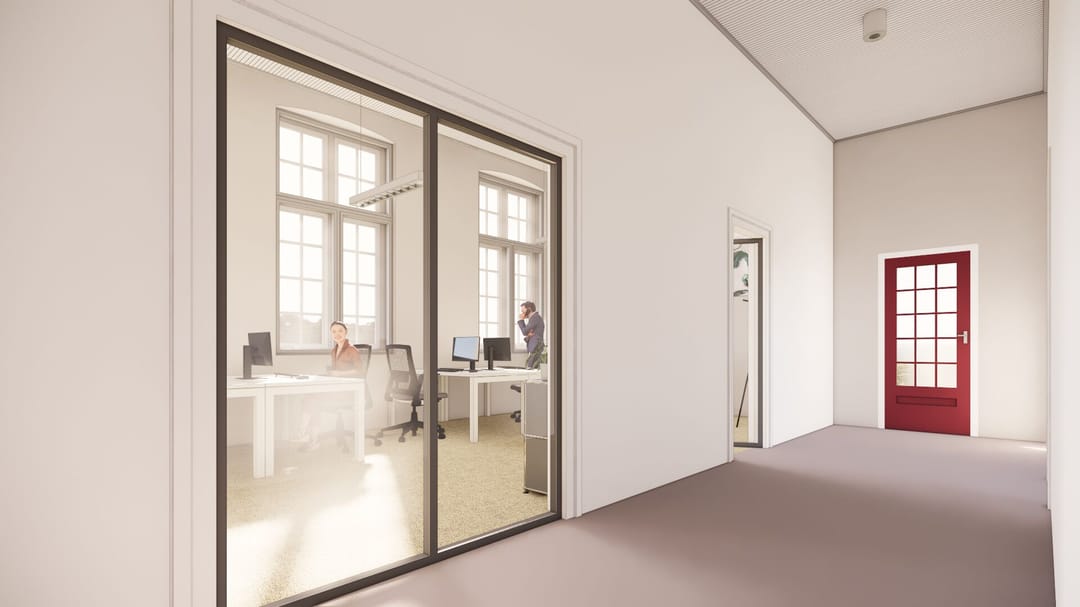 Deze ruimten ademen de kwaliteit die past bij het monumentale karakter van het gebouw. De afwerking met systeemplafonds, stucwerk en vloerbedekking zorgt voor een zakelijke en verzorgde
