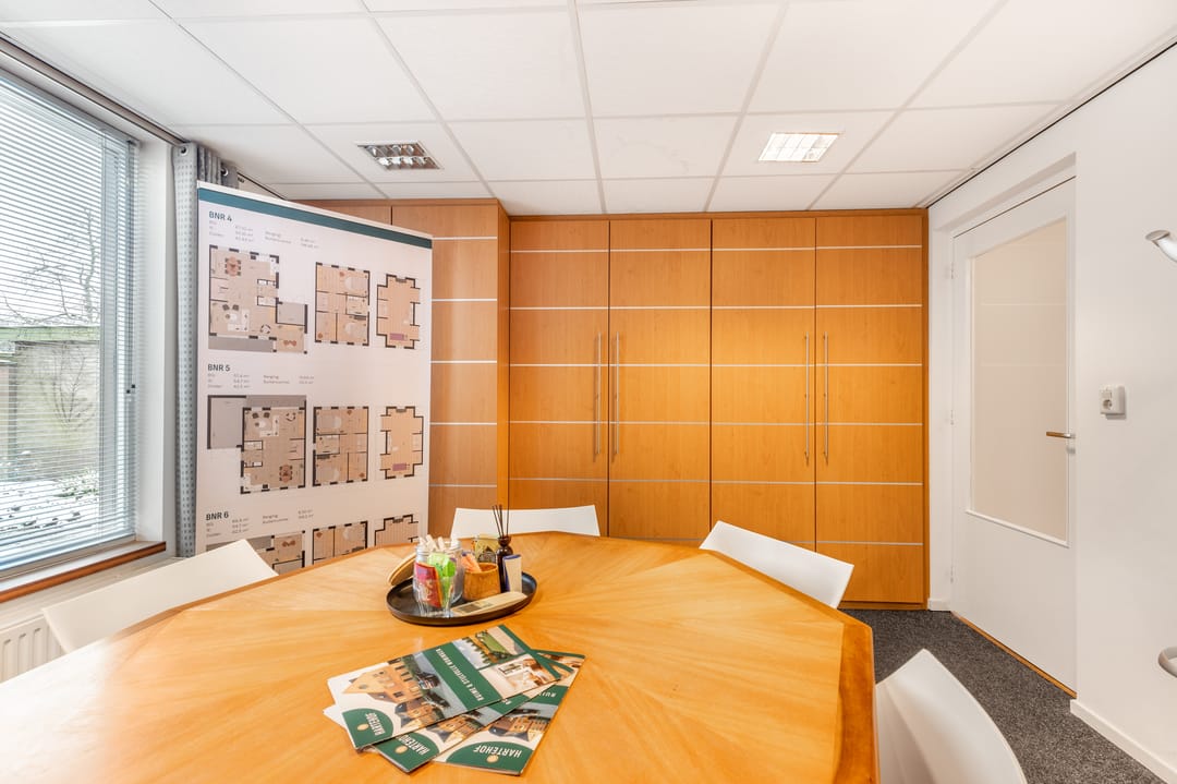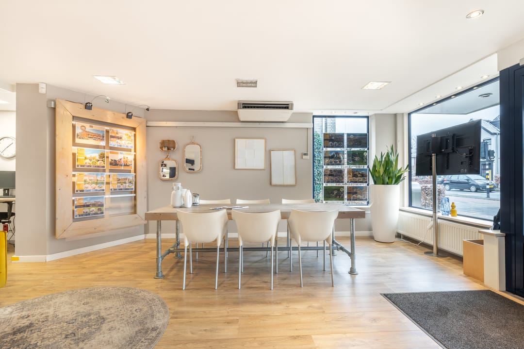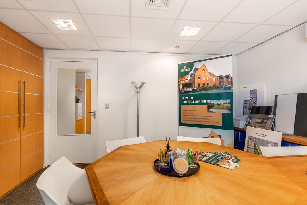 Het kantoor is op de begane grond en is een grote overzichtelijke ruimte voorzien van 2 'prive' werkplekken met aan de achterzijde een een vergaderruimte en toegang tot een heerlijke tuin op het zuiden met een eigen berging voor de nodige opslag. De pantry en het toilet maken het geheel af.