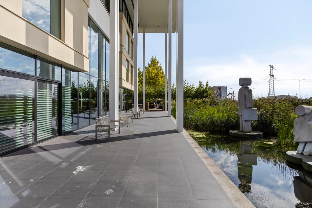 Grenzend aan de begane grond is er een royaal terras voor ontvangsten van genodigden. De drijvende beelden in de vijver worden niet mee verkocht.