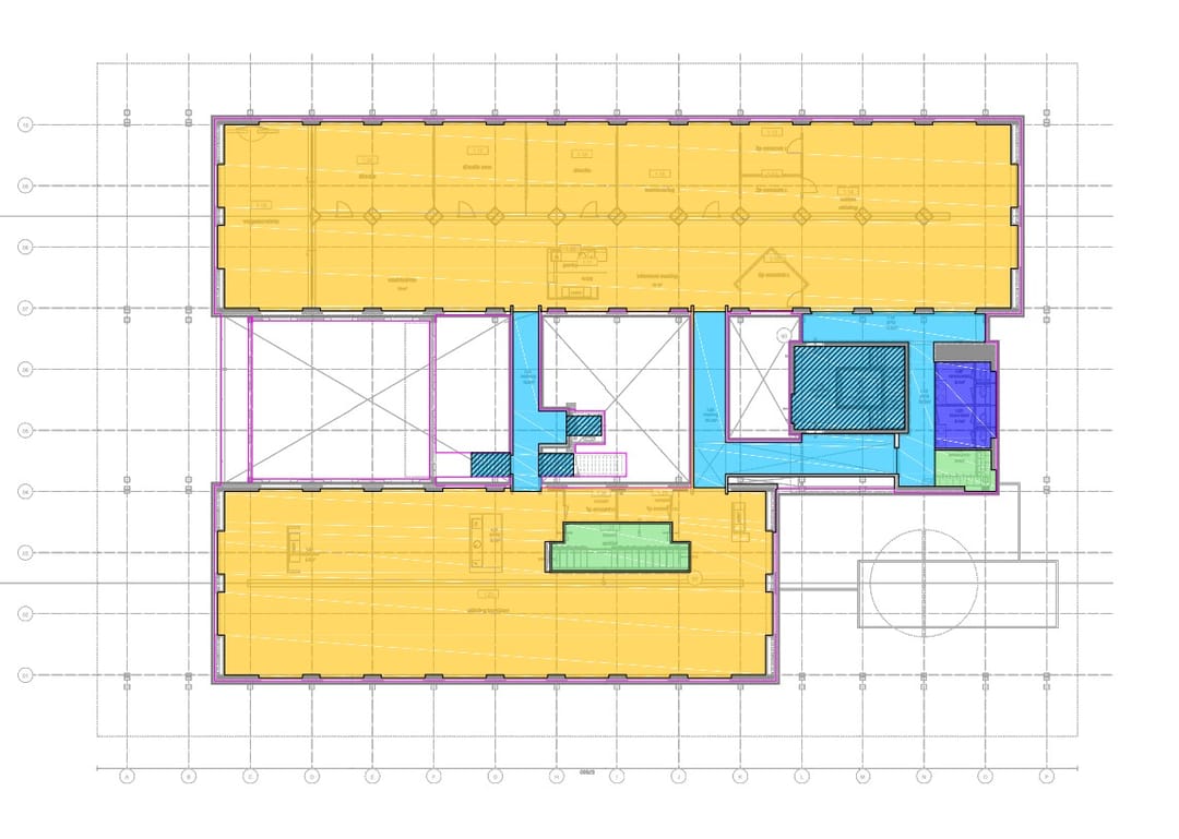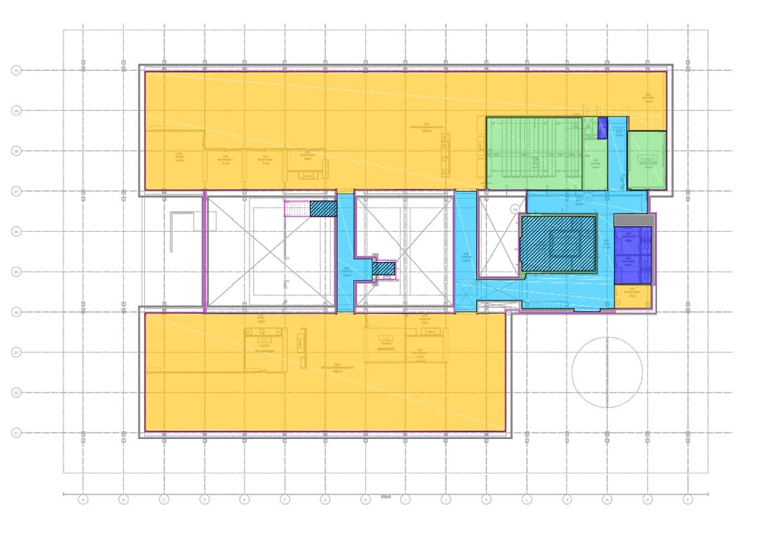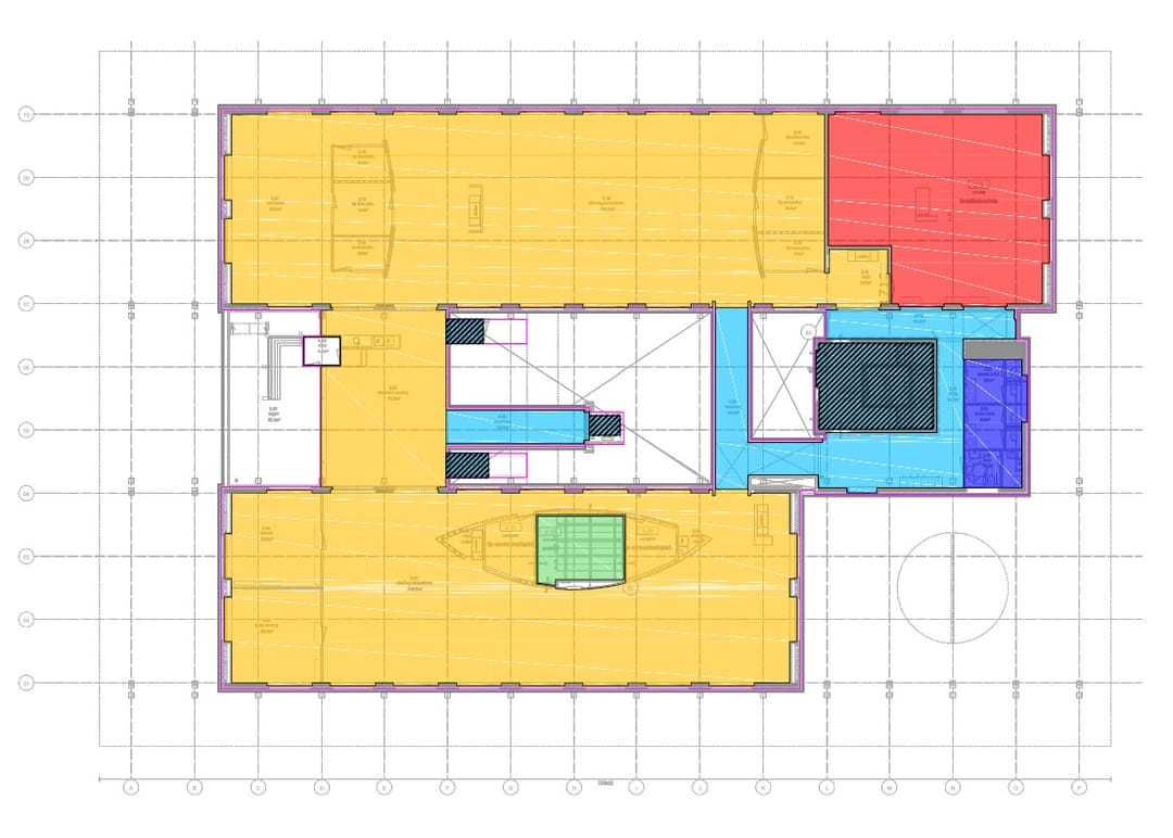 - Hoofddraagstructuur bestaande uit stalen kolommen, op de begane grond versterkt met vakwerkspanten, op een fundering van betonnen heipalen met betonnen randbalken en betonnen vloeren;