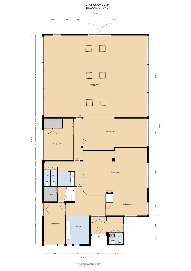 Entree met toegang tot onder andere kantoorruimtes, spreekkamers, directiekamer, twee keukens, lounge, grote kantoortuin (181 m²) en 3 toiletten.