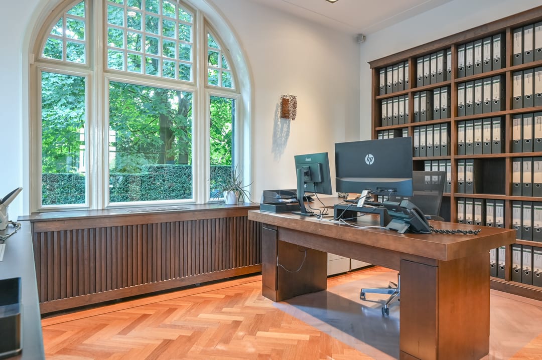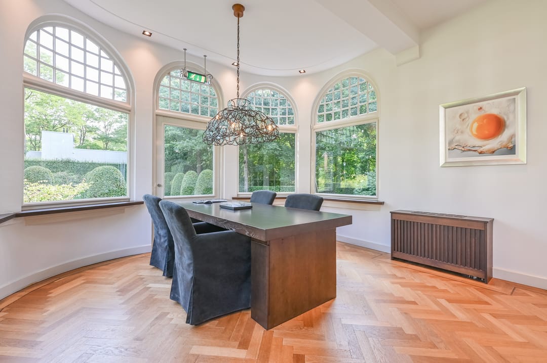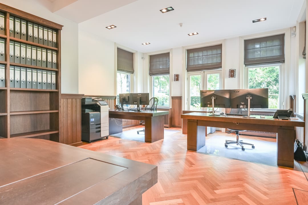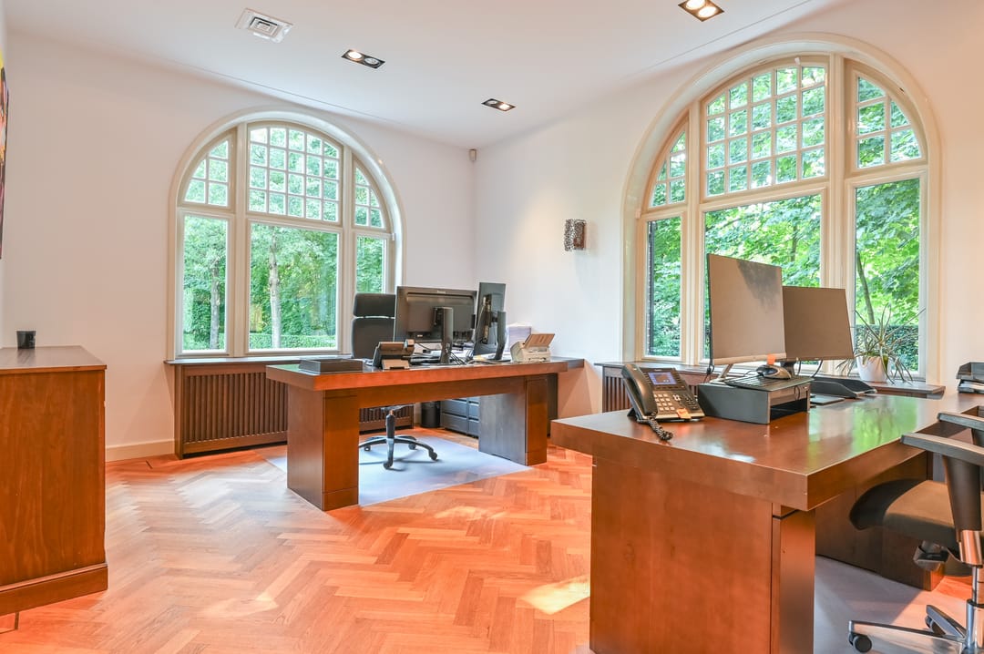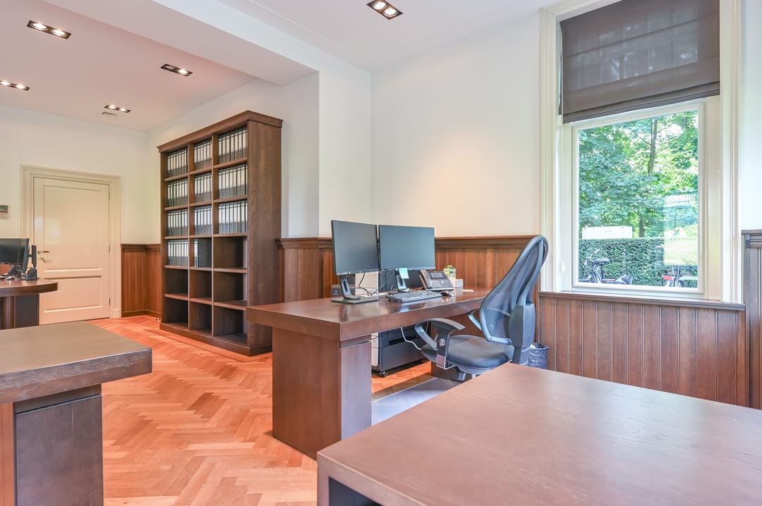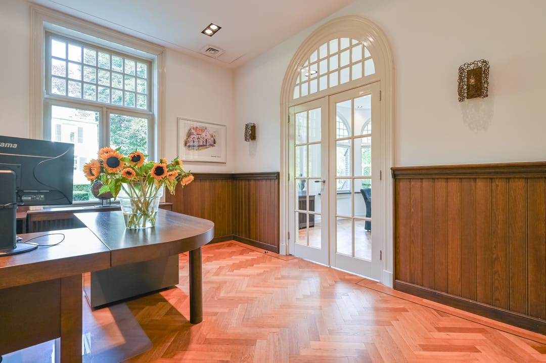 * Zeer royale werkruimte met uitzicht over de achtertuin. Deze ruimte bestaat uit drie kamers, aan elkaar verbonden door ensuite schuifdeuren: waaronder een halfronde tuinkamer met deur naar en zicht over de tuin.