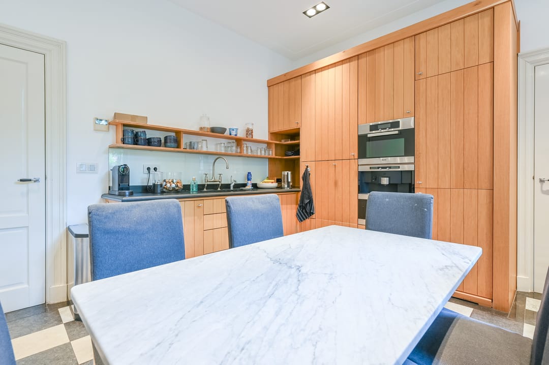 * Keuken met op maat gemaakte houten inrichting met granieten blad en verzonken gootsteen, kokend waterkraan, inbouwoven, -koffieapparaat en -bordenwarmer (allen Miele), koelkast en vriezer.