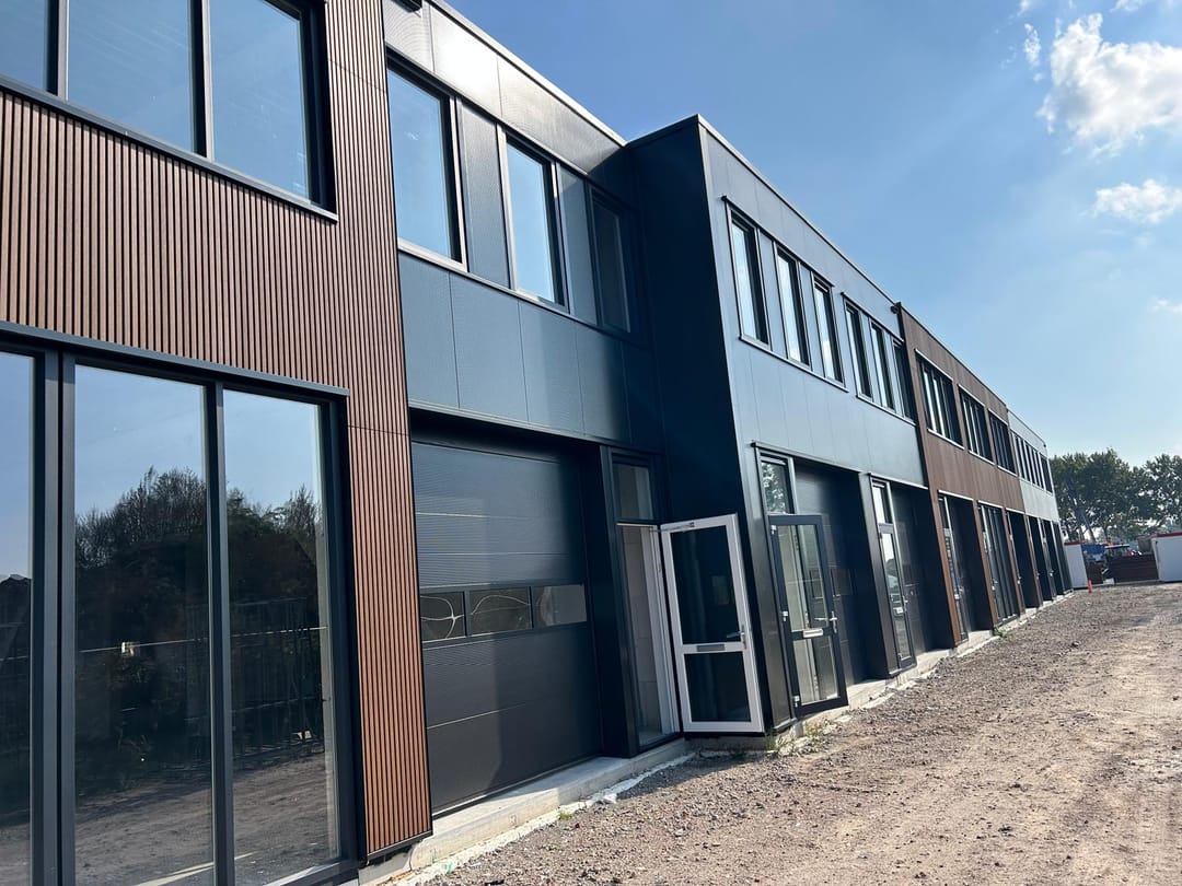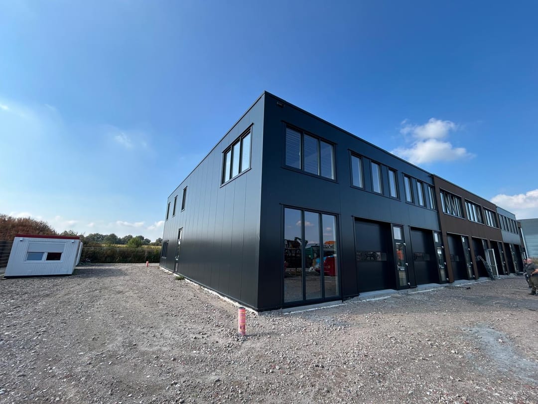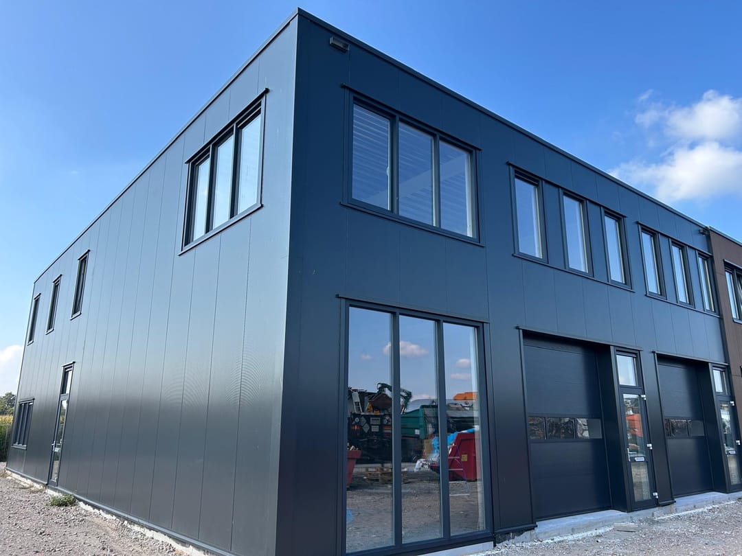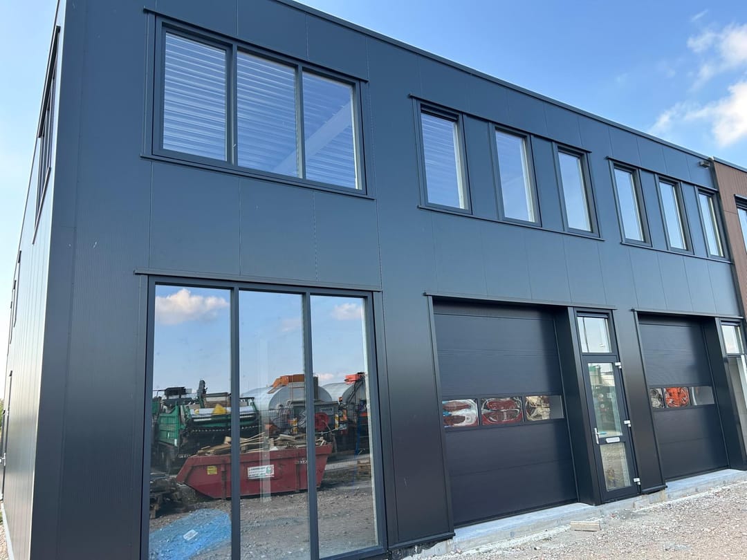 Het bedrijfsverzamelgebouw is opgetrokken uit een staalconstructie en afgewerkt met luxe zwarte sandwichpanelen en hout, wat zorgt voor een moderne en professionele uitstraling. Door het royale gebruik van ramen op de verdieping wordt de kantoorruimte als ruim en licht ervaren. De verdieping is voorzien van ramen inclusief een draai-/kiepraam, waardoor ventilatie en gebruikscomfort goed zijn geborgd.